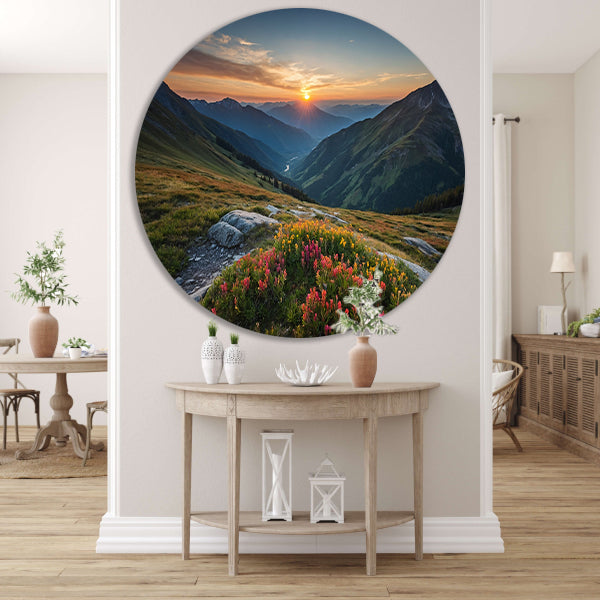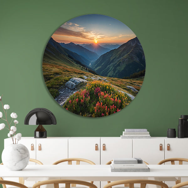 Breng de schoonheid van de natuur in huis met deze prachtige berglandschap bij zonsondergang aluminium muurcirkel en geniet elke dag van het serene uitzicht. Een ware eyecatcher voor elk interieur!