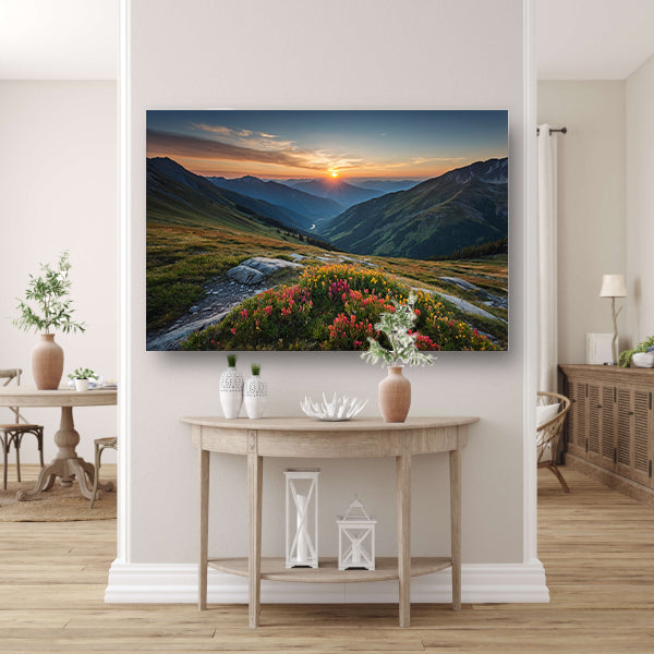 Prachtig berglandschap bij zonsondergang canvas met baklijst