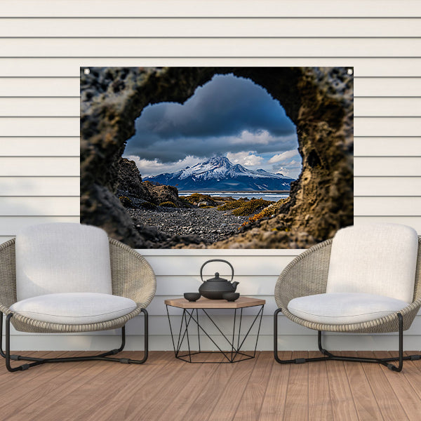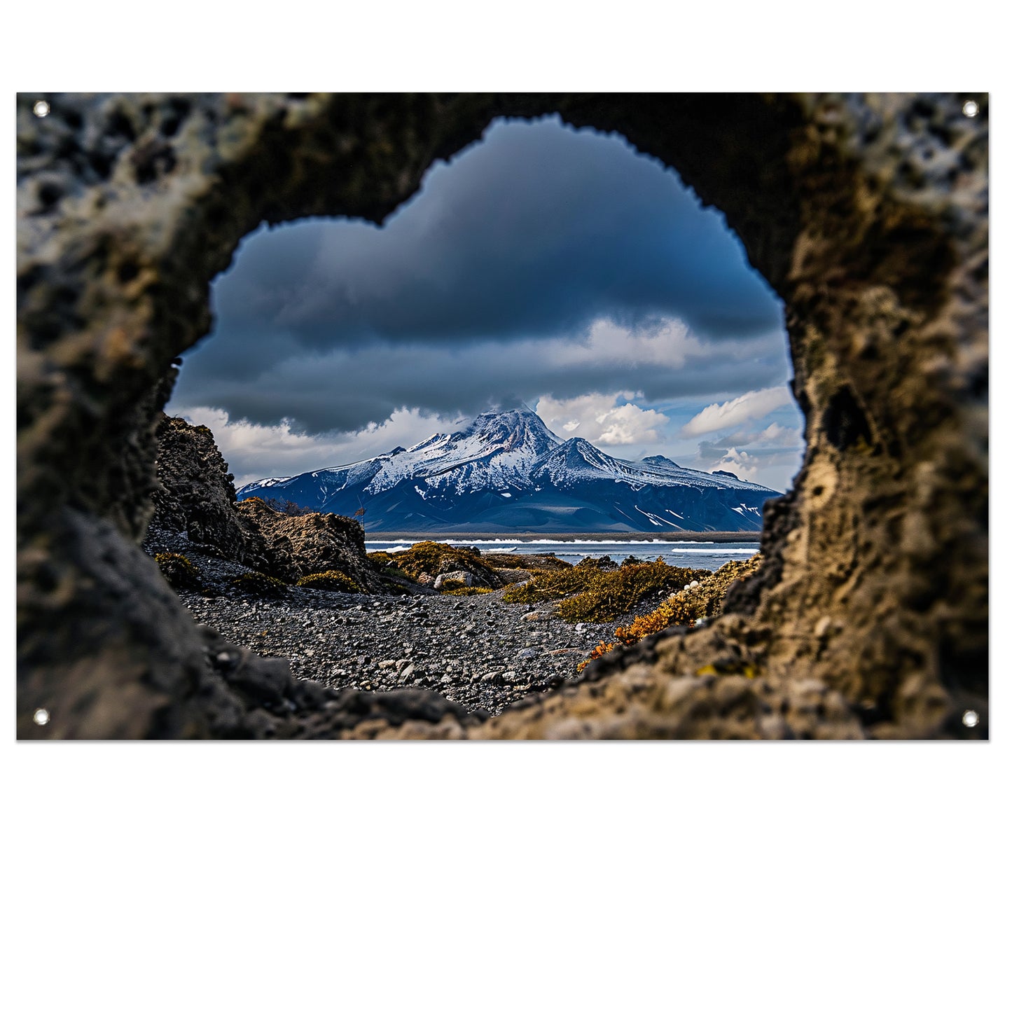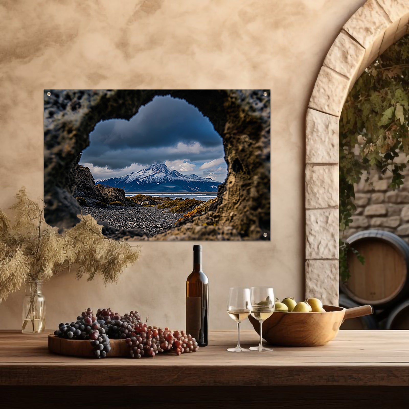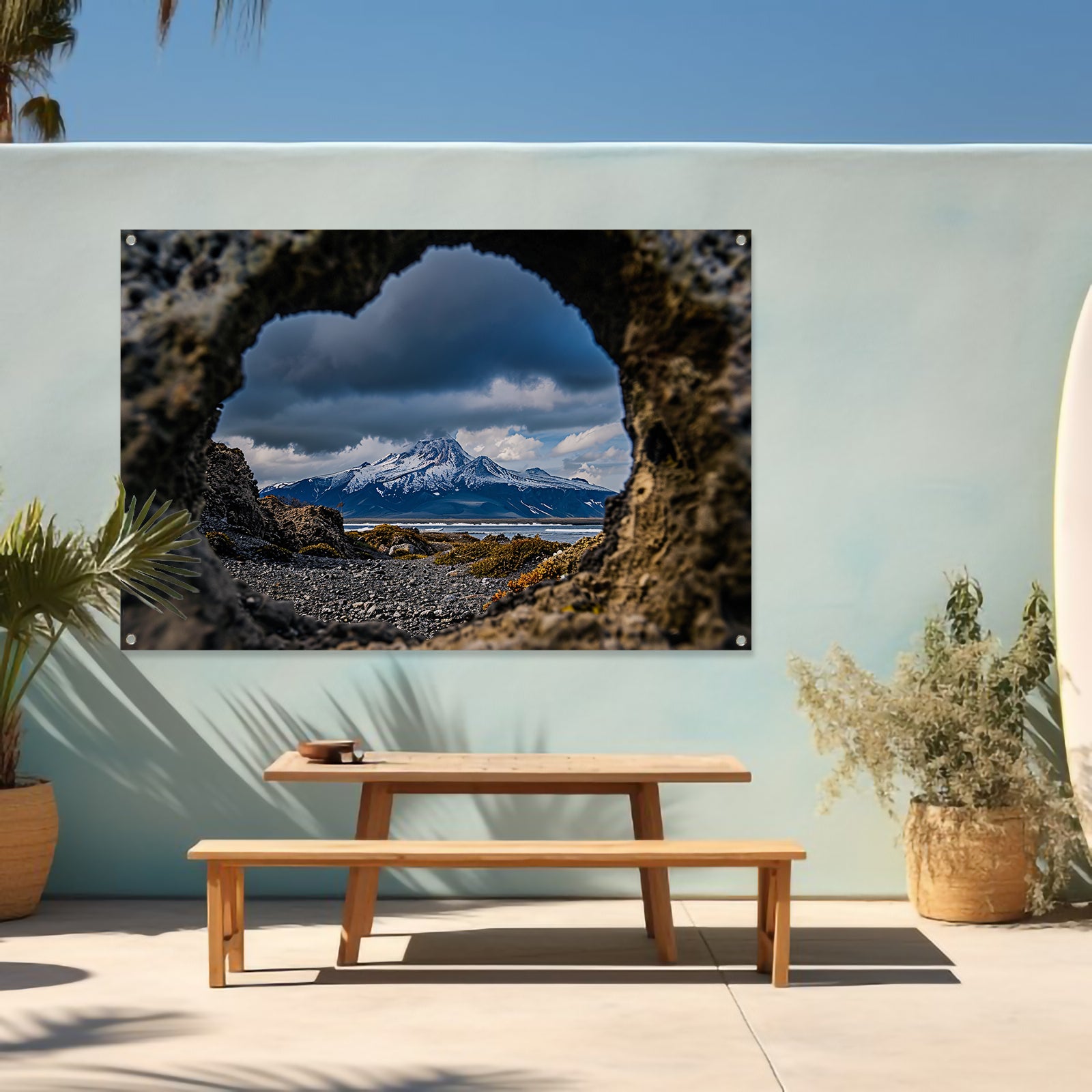 Prachtig uitzicht op vulkaan door rotsopening tuinposter