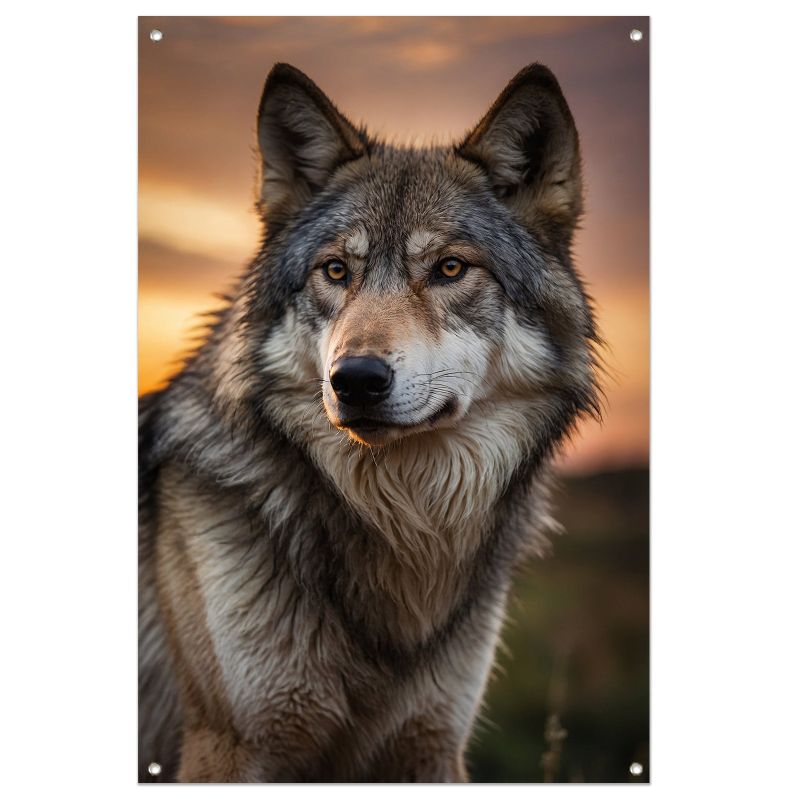 Prachtig wolfportret tijdens zonsondergang tuinposter