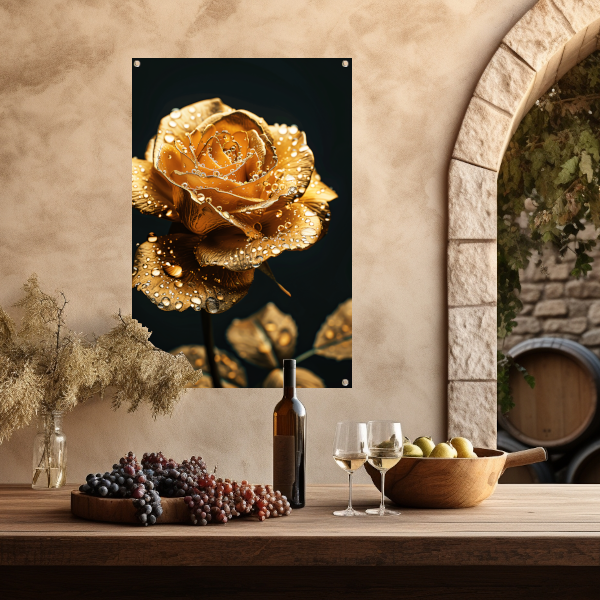 Prachtige gouden roos met reflecterende waterdruppels tuinposter