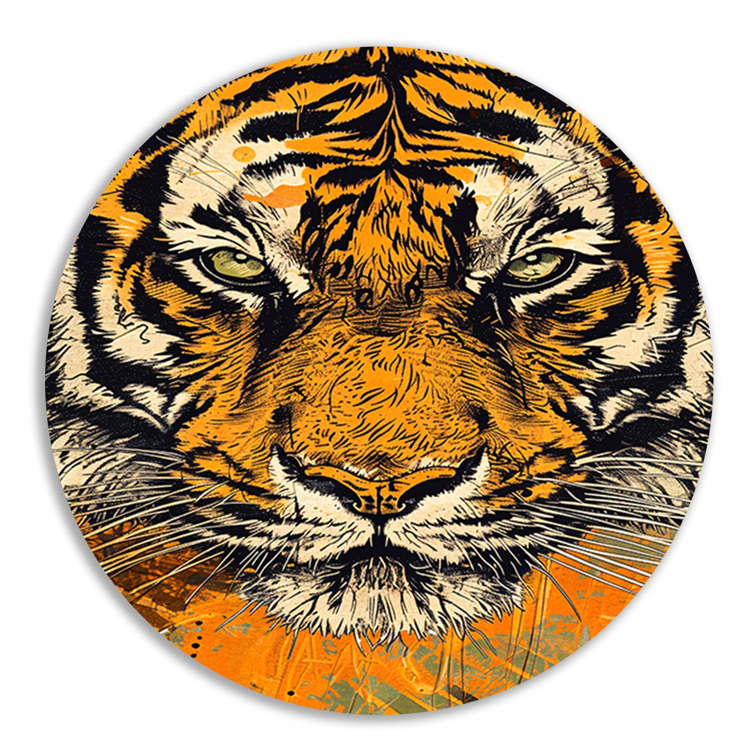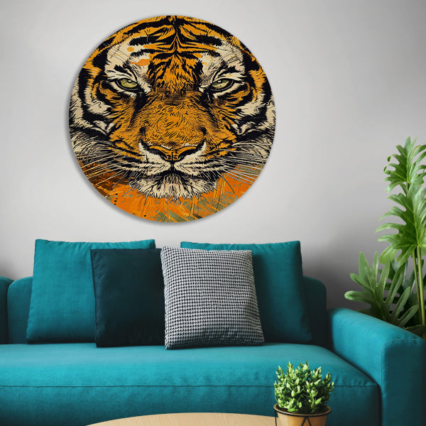 De tijger lijnkunst is gedrukt in levendige en dynamische kleuren die de kracht en gratie van dit majestueuze dier benadrukken. De cirkelvormige vorm voegt een modern tintje toe aan uw interieur en past perfect in elke kamer.