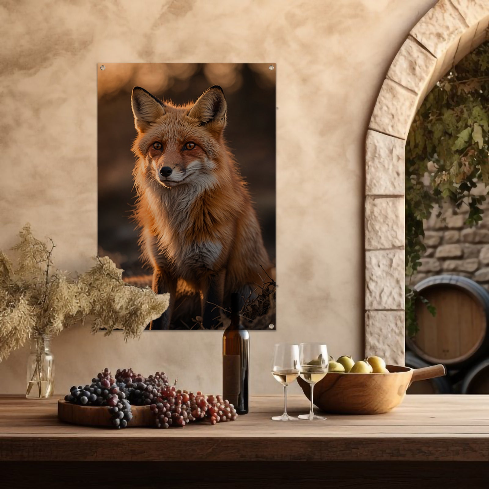 Prachtige vos tijdens zonsondergang in natuur tuinposter