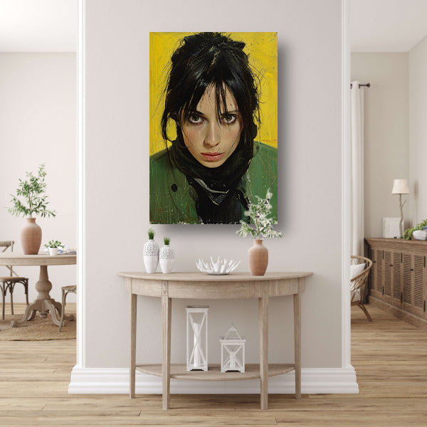 Realistisch portret van een vrouw met gele achtergrond acrylglas
