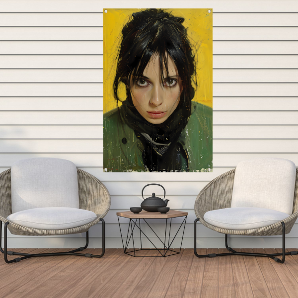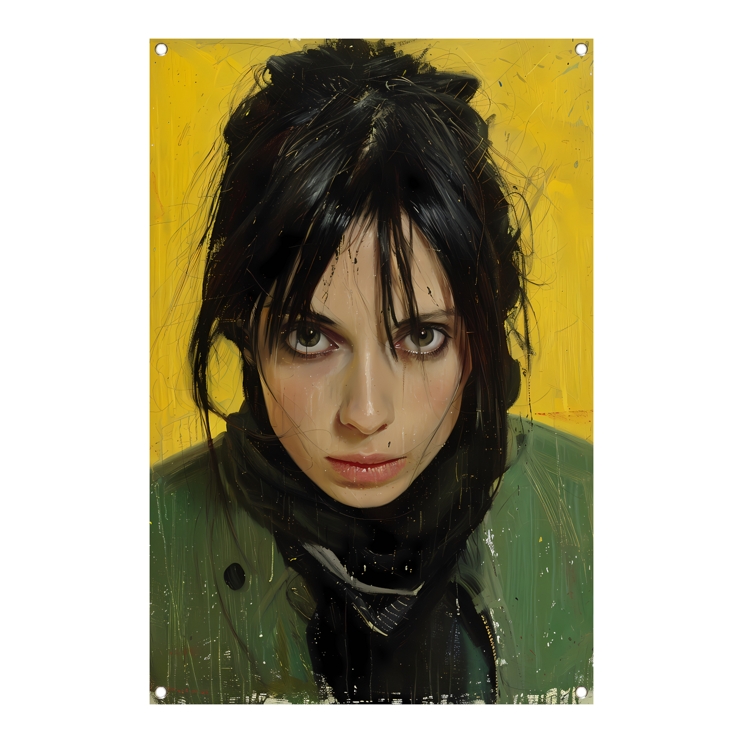 Realistisch portret van een vrouw met gele achtergrond tuinposter
