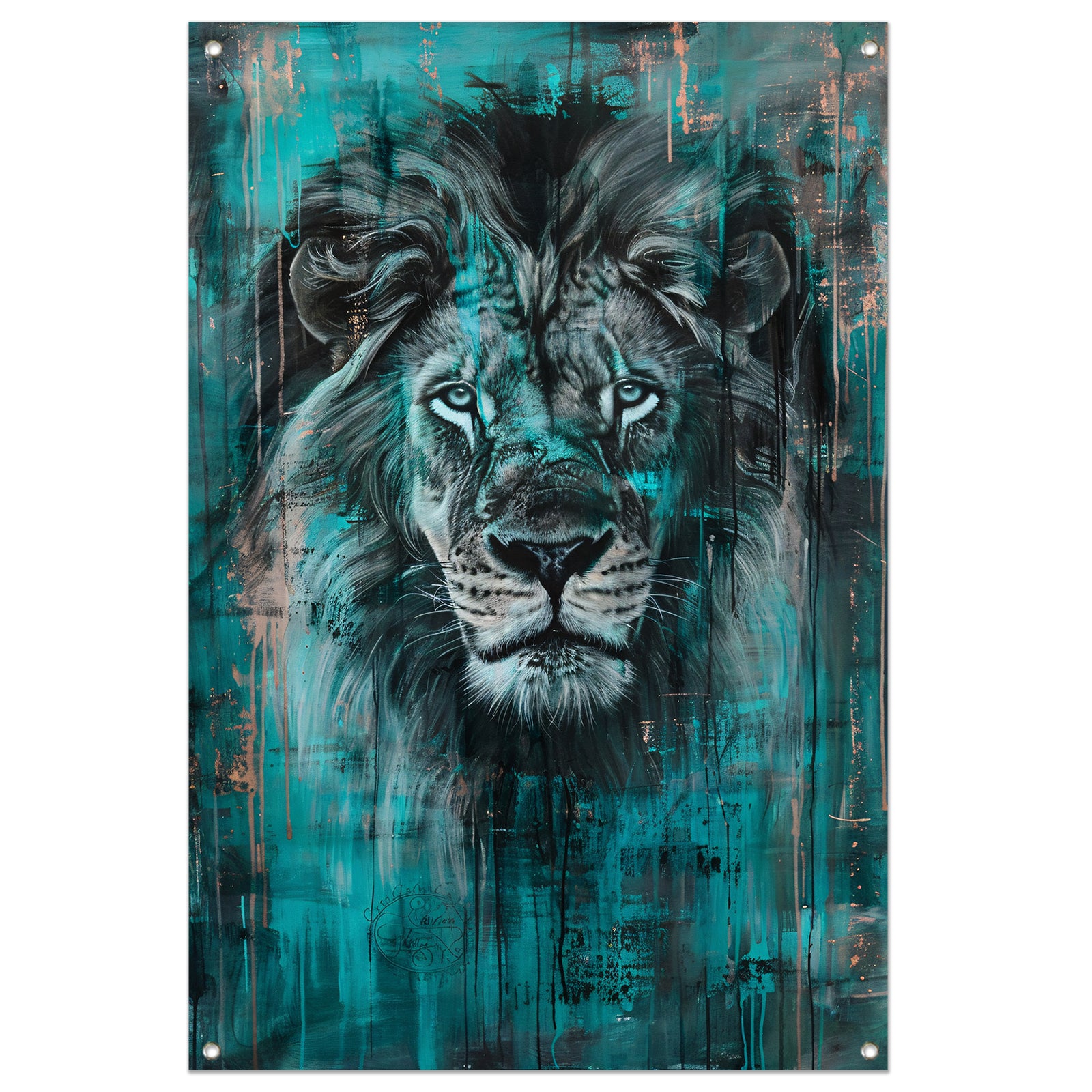 Realistisch schilderij van een majestueuze leeuw tuinposter