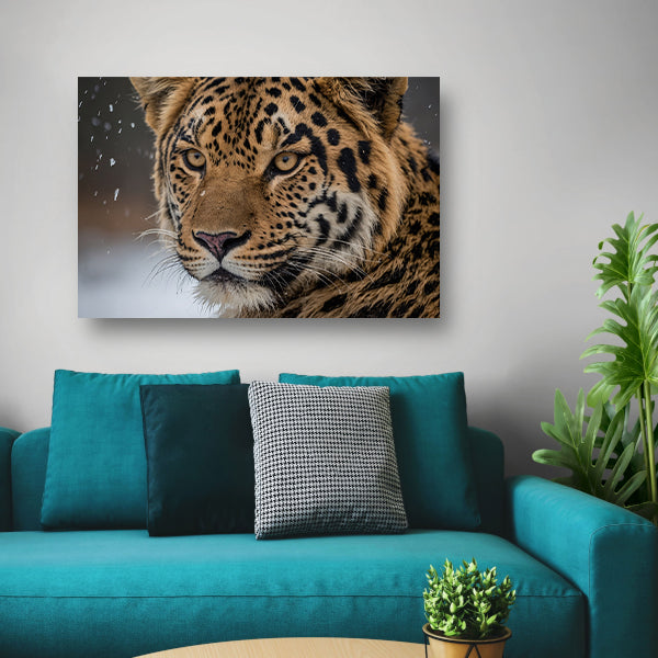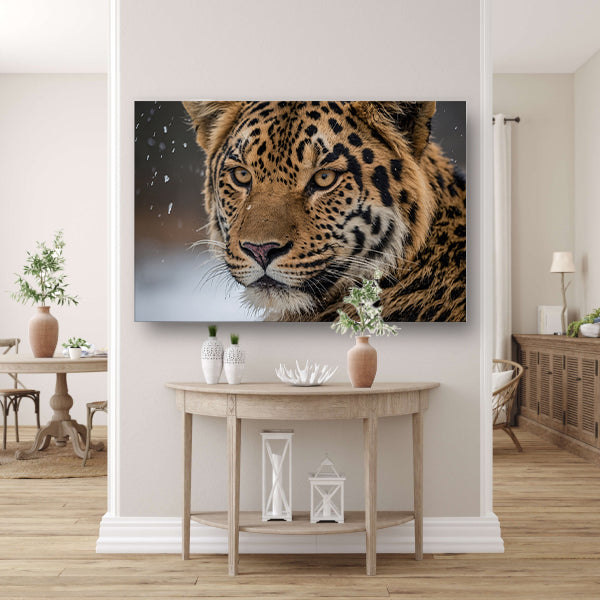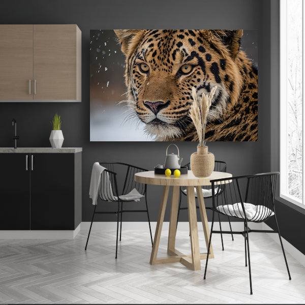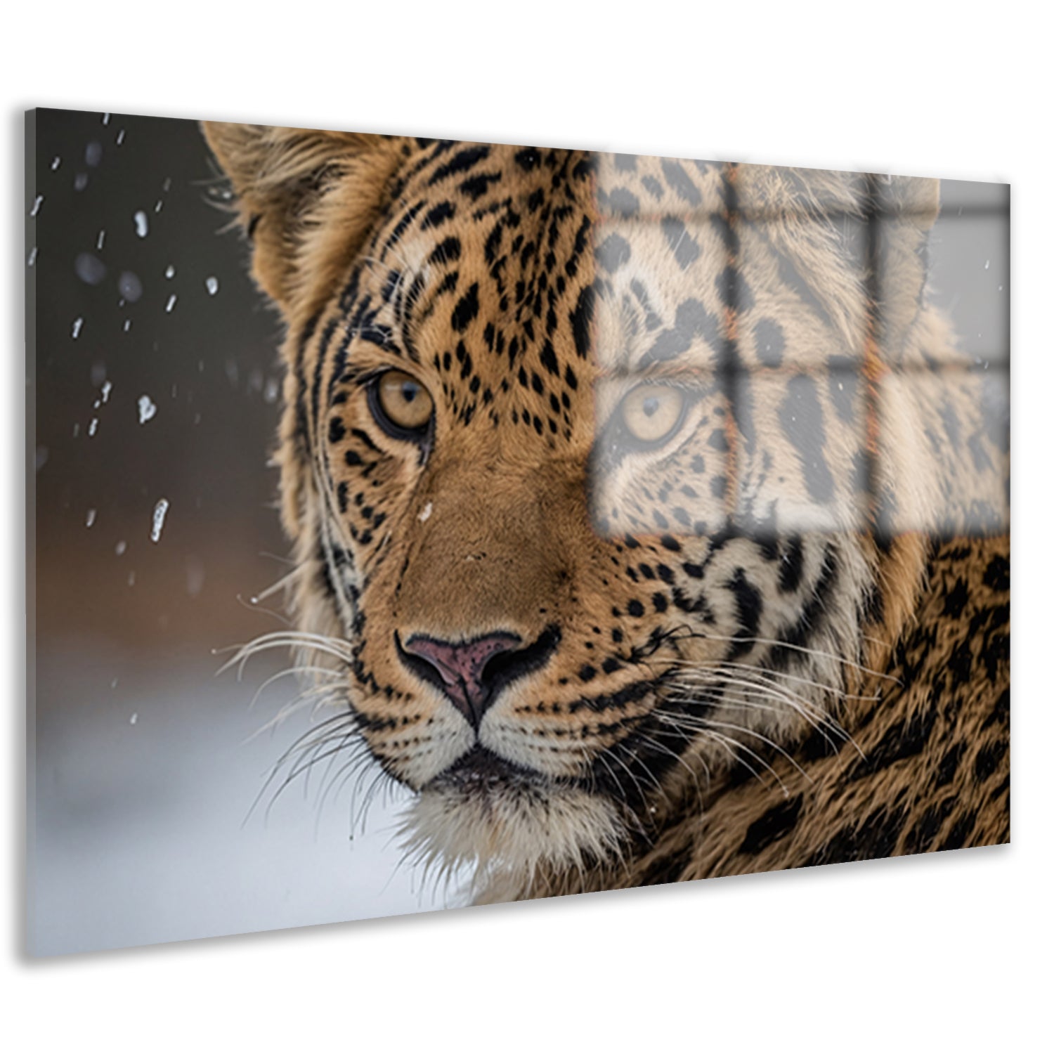 Realistische close-up van een luipaard in sneeuw acrylglas