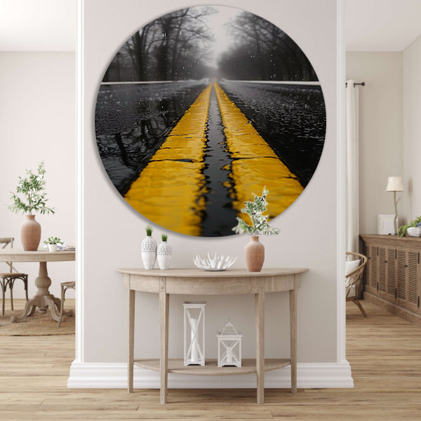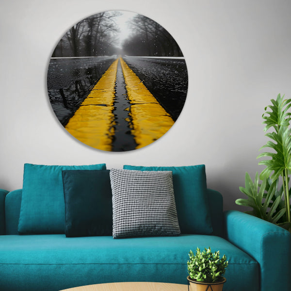 Regenachtige weg met gele strepen aluminium muurcirkel