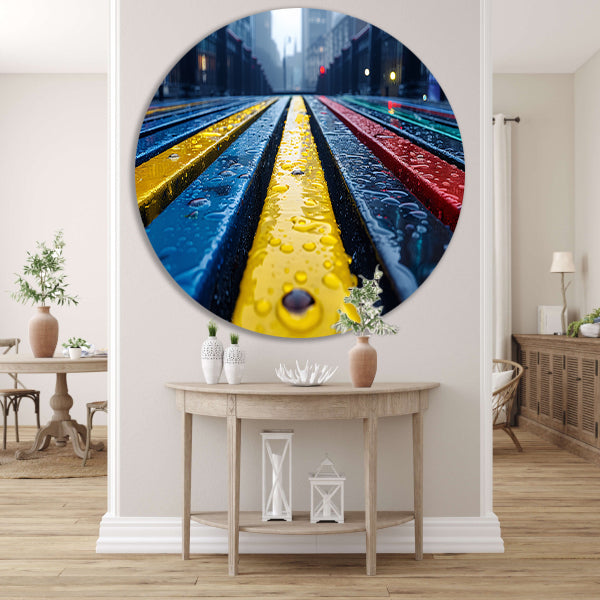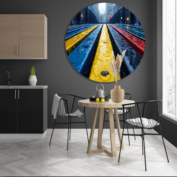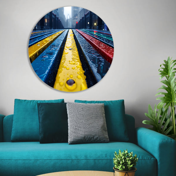Voeg wat kleur toe aan je interieur met de Regenboogbanken aluminium muurcirkel en geniet van een unieke en trendy uitstraling in huis.