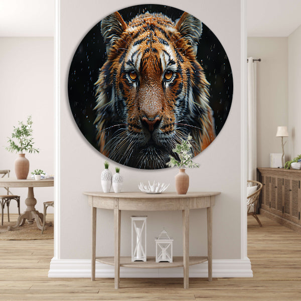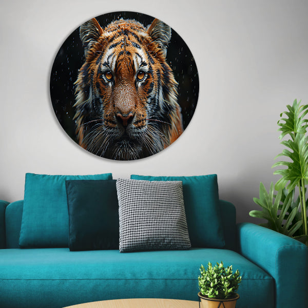 Regenbui op tijger aluminium muurcirkel