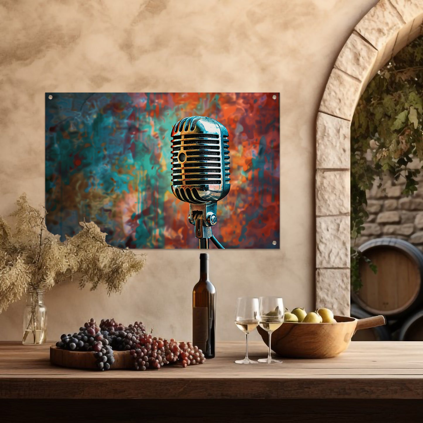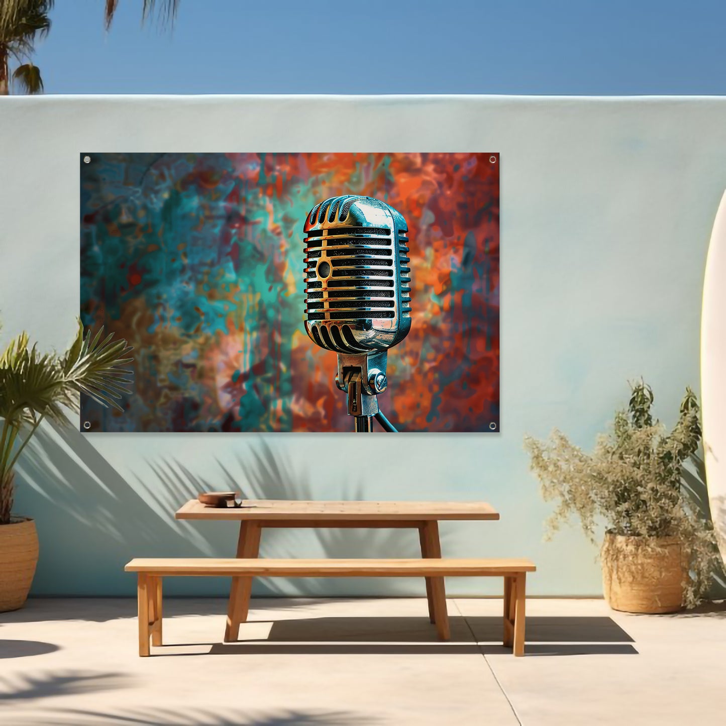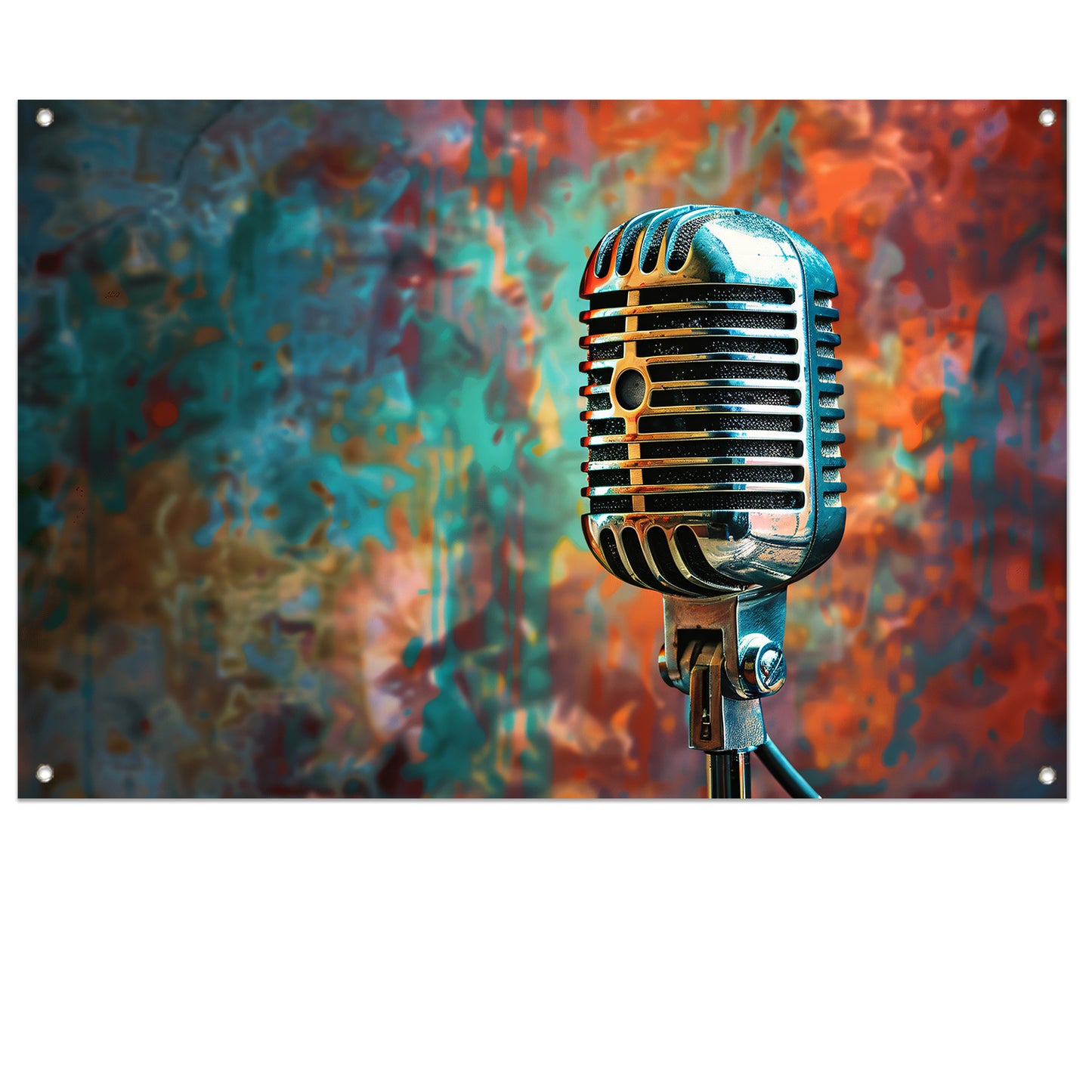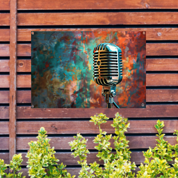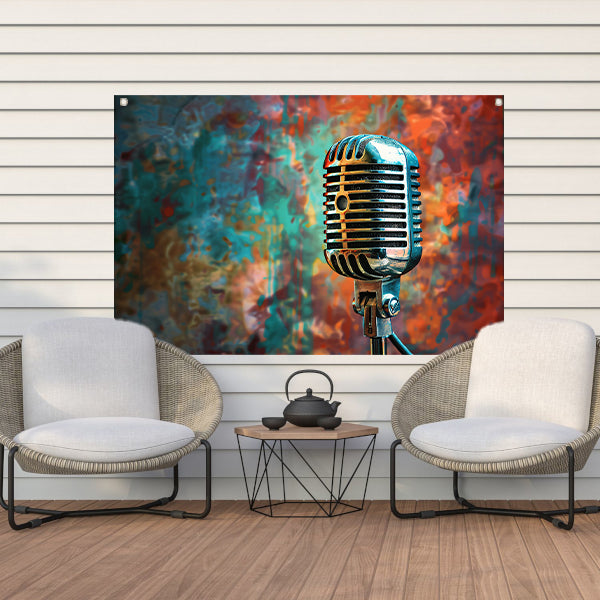 Retro microfoon met abstracte kleurenspatten tuinposter