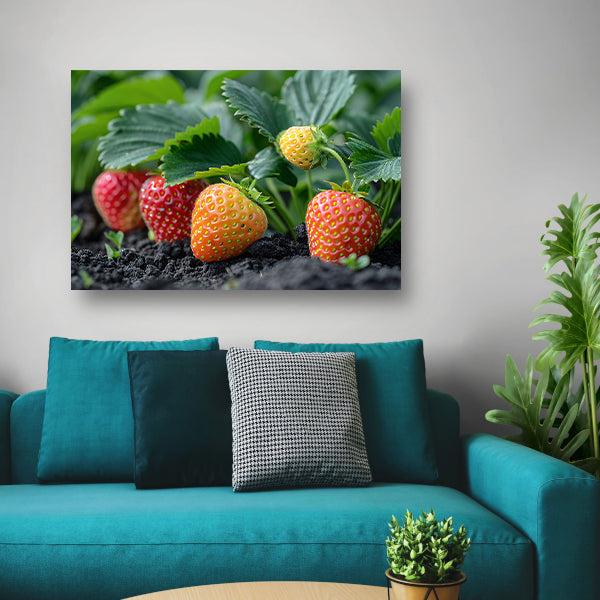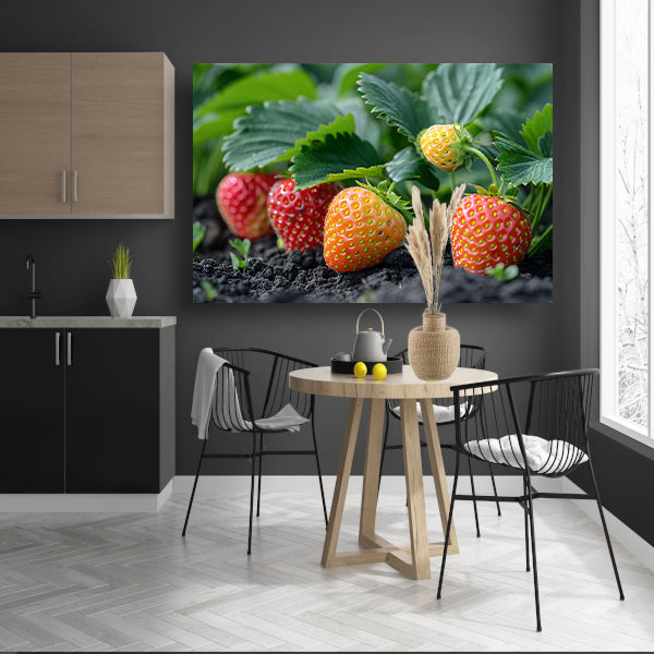 De aardbeienplant is volledig rijp en klaar om geplukt te worden, waardoor het een perfecte keuze is voor liefhebbers van fruit, tuinieren of gewoon voor diegenen die houden van levendige en kleurrijke kunstwerken. Dit veelzijdige stuk is verkrijgbaar in meerdere maten, zodat je de perfecte pasvorm kunt vinden voor jouw ruimte.