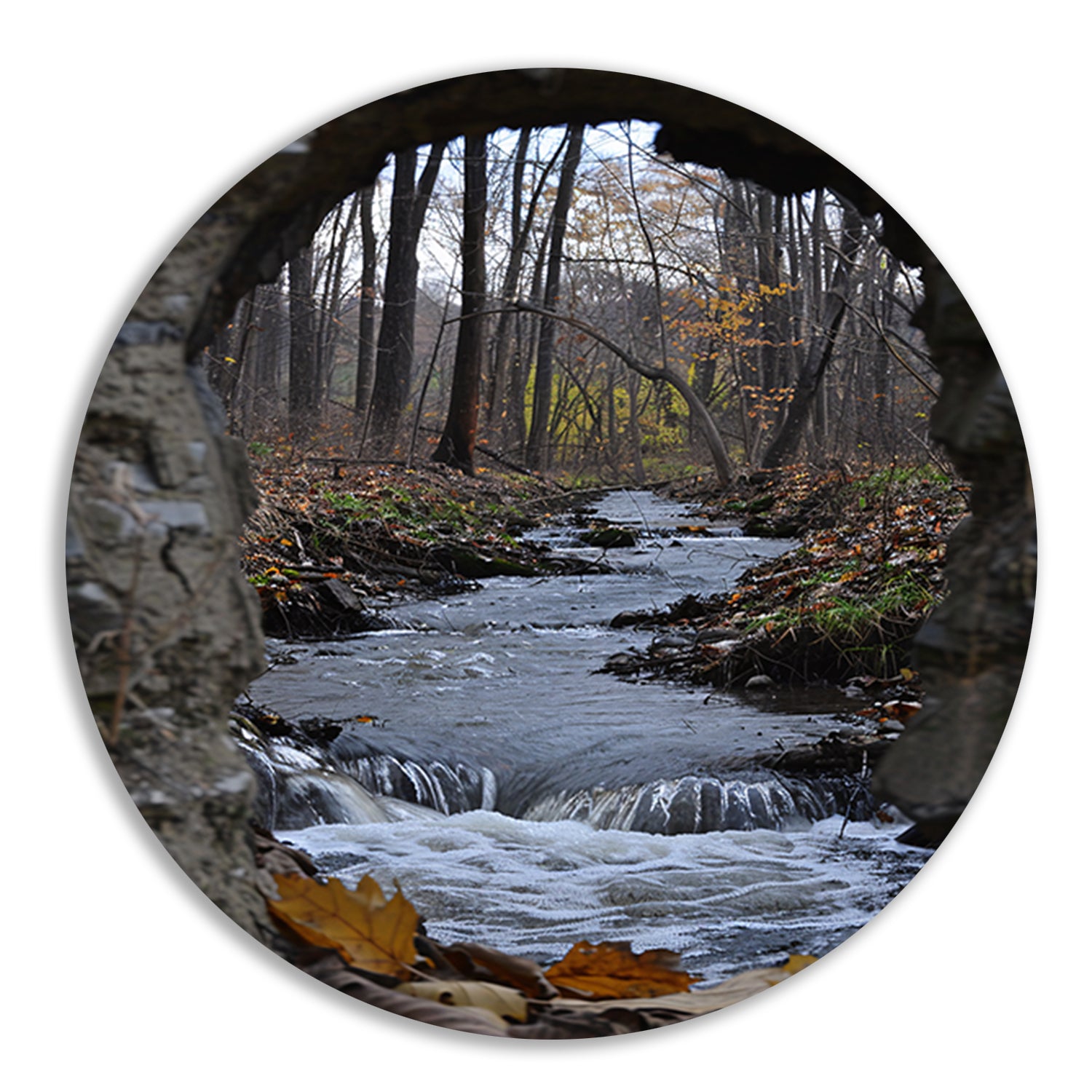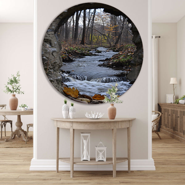 Rivier stroomt door stenen raam in herfstbos aluminium muurcirkel
