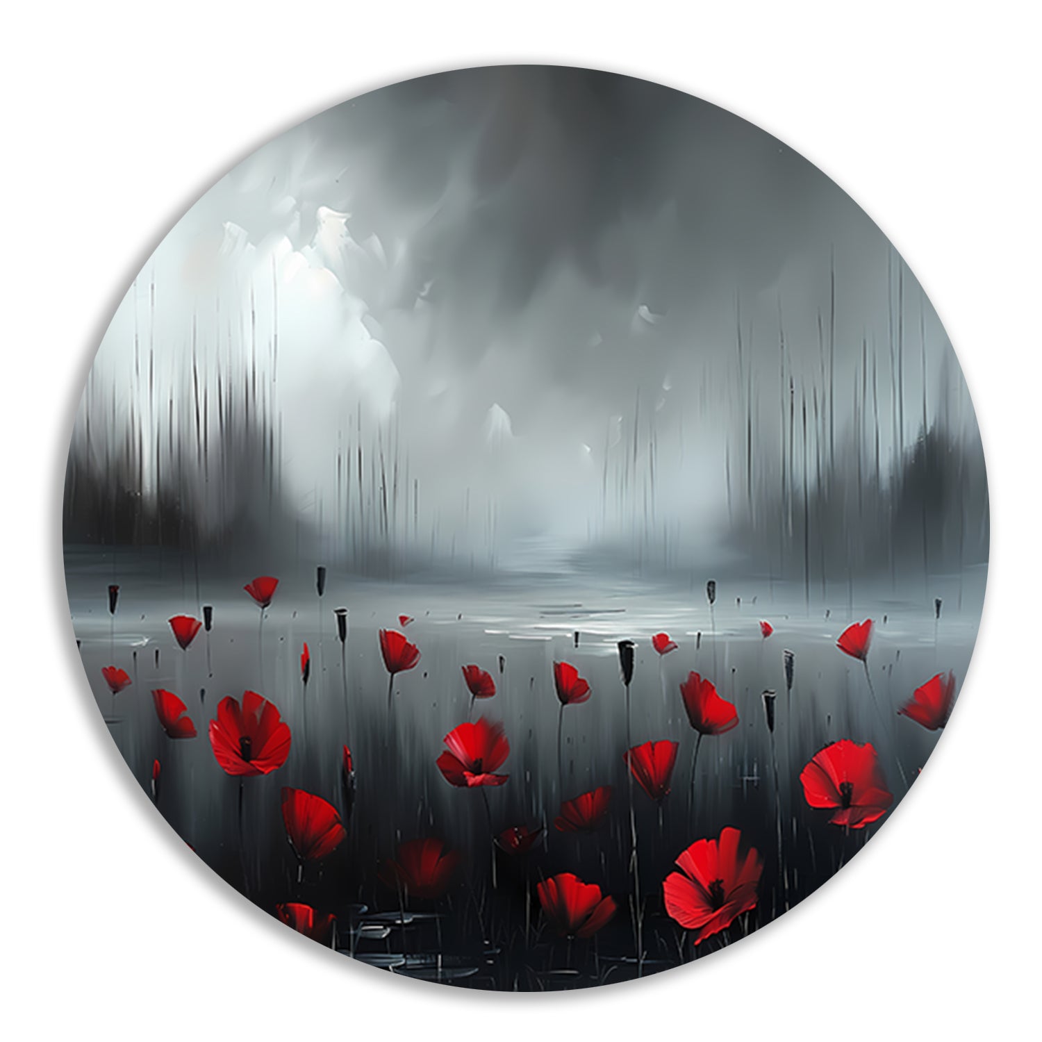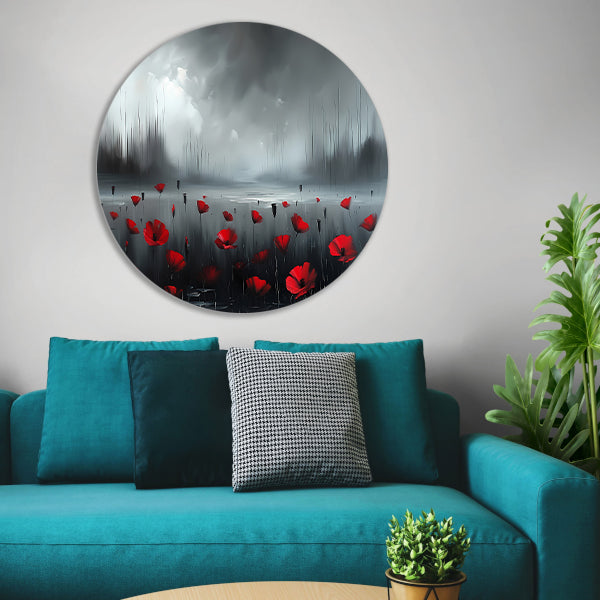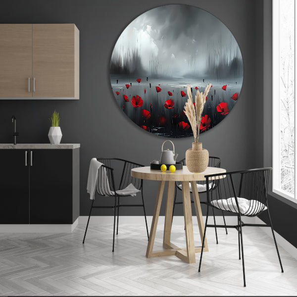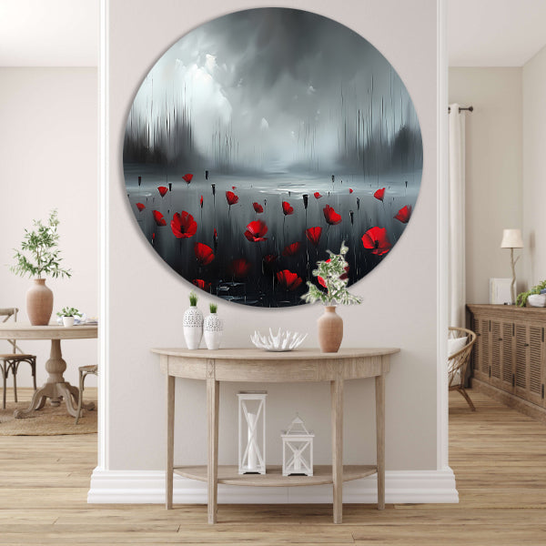 Rode bloemen in een mistig landschap aluminium muurcirkel