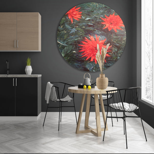 Breng de schoonheid van de natuur in huis met deze rode cactusdahlias muurcirkel van Gustave Caillebotte, en geniet dagelijks van een vleugje kleur en leven in uw woning.