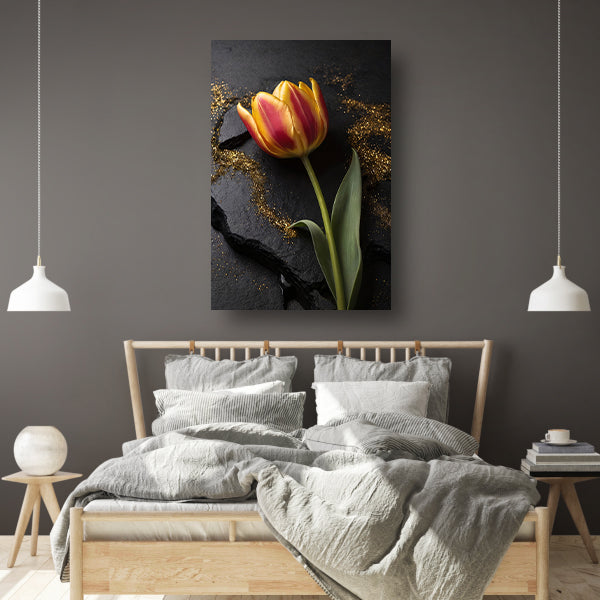 Rode en Gele Tulp met Gouden Glitters canvas met baklijst