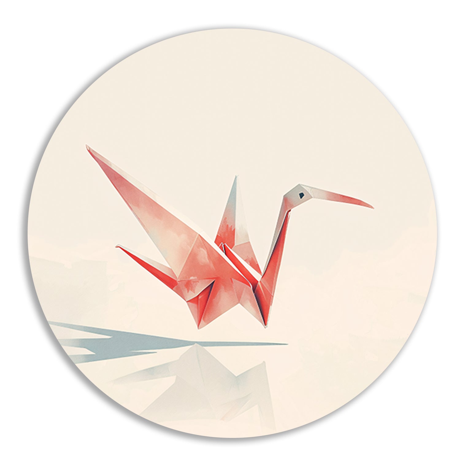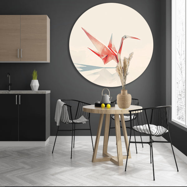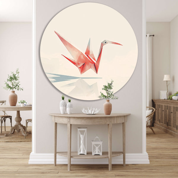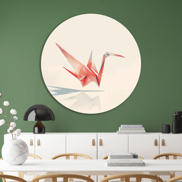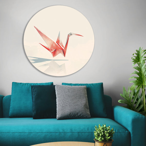 Rode origami kraanvogel met schaduw aluminium muurcirkel