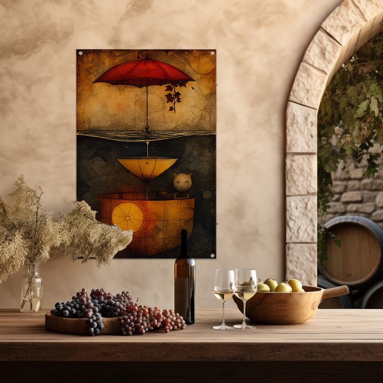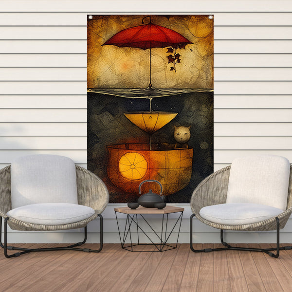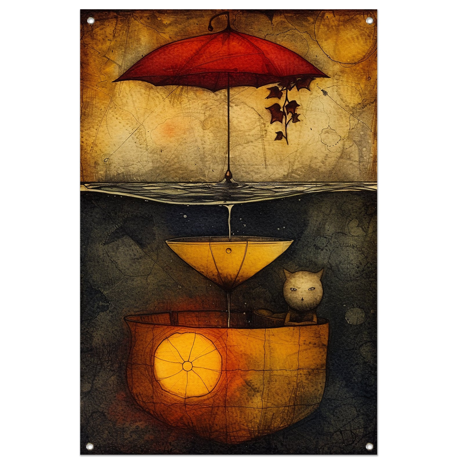 Rode Paraplu, Omgekeerde Gele Paraplu en Kat tuinposter