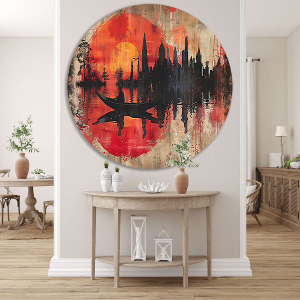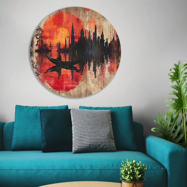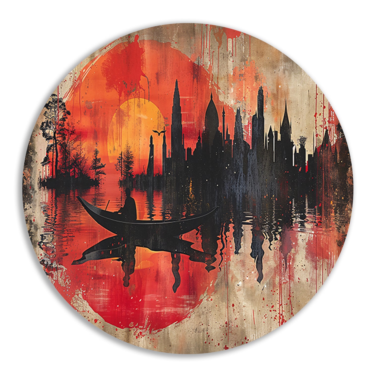 Roeiboot onder Rode Zonsondergang bij Stad aluminium muurcirkel