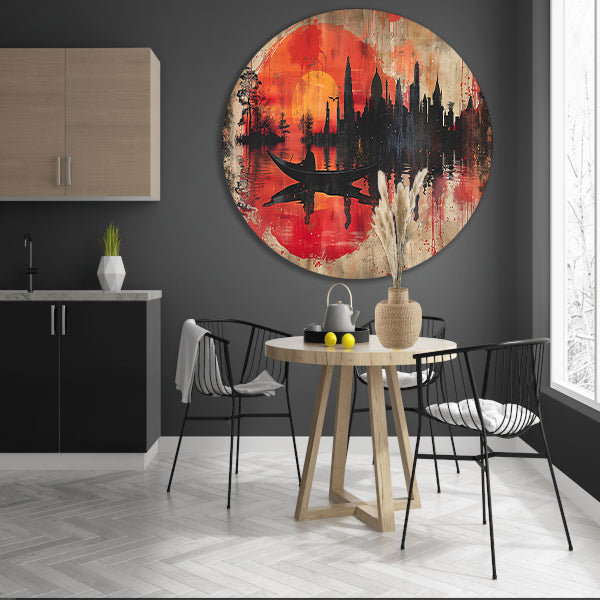 De muurcirkel wordt geleverd met een handige ophangplaat, waardoor je hem eenvoudig aan de muur kunt bevestigen. Daarnaast is deze aluminium muurcirkel verkrijgbaar in diverse afmetingen, zodat je hem perfect kunt afstemmen op de beschikbare ruimte in je interieur. Voeg een vleugje natuur en sereniteit toe aan je woning met deze prachtige roeiboot muurcirkel onder een rode zonsondergang bij de stad.