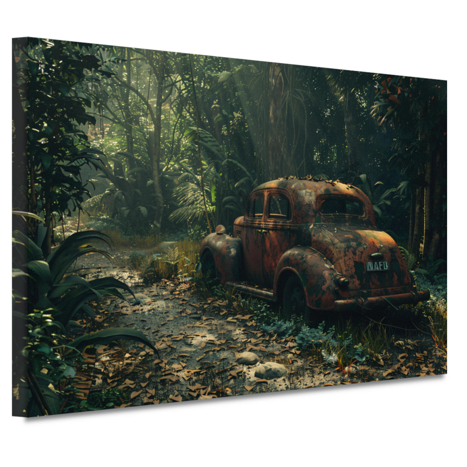 Roestige auto overgroeid door jungle canvas