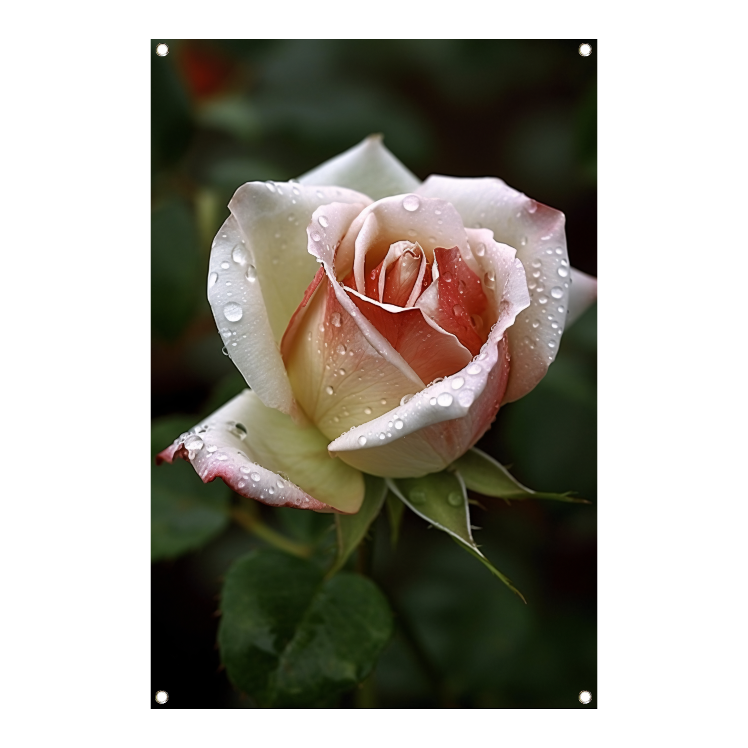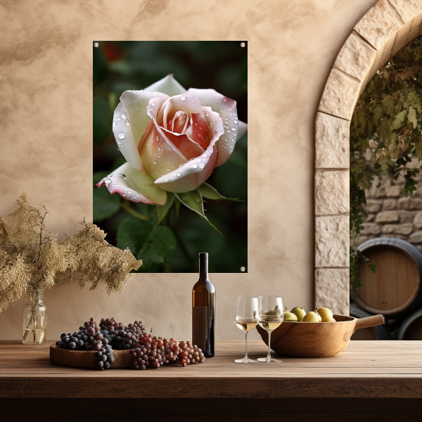 Het thema van deze tuinposter is de natuur en de bloeiende roos staat centraal. De close-up weergave van de roos met de glinsterende waterdruppels zorgt voor een uniek en bijna magisch effect. Het is alsof je de roos kunt aanraken en de geur kunt ruiken.