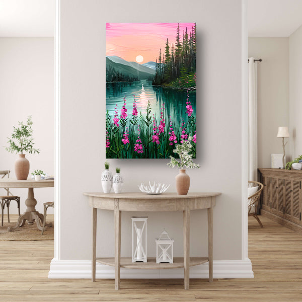 Roze zonsondergang bij rustig bergmeer met bloemen acrylglas