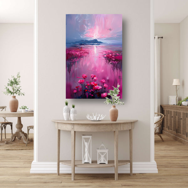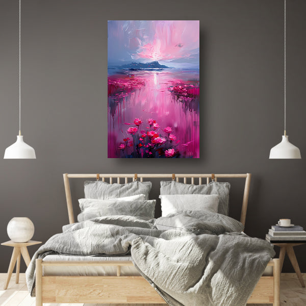 Roze zonsondergang en bloemen aan de waterkant acrylglas