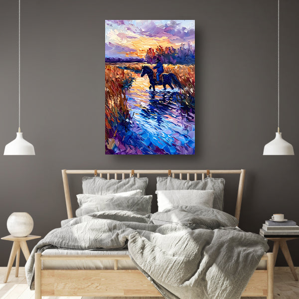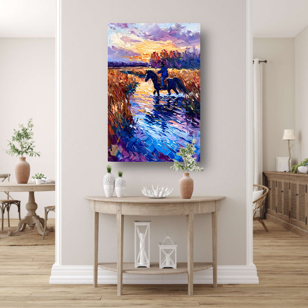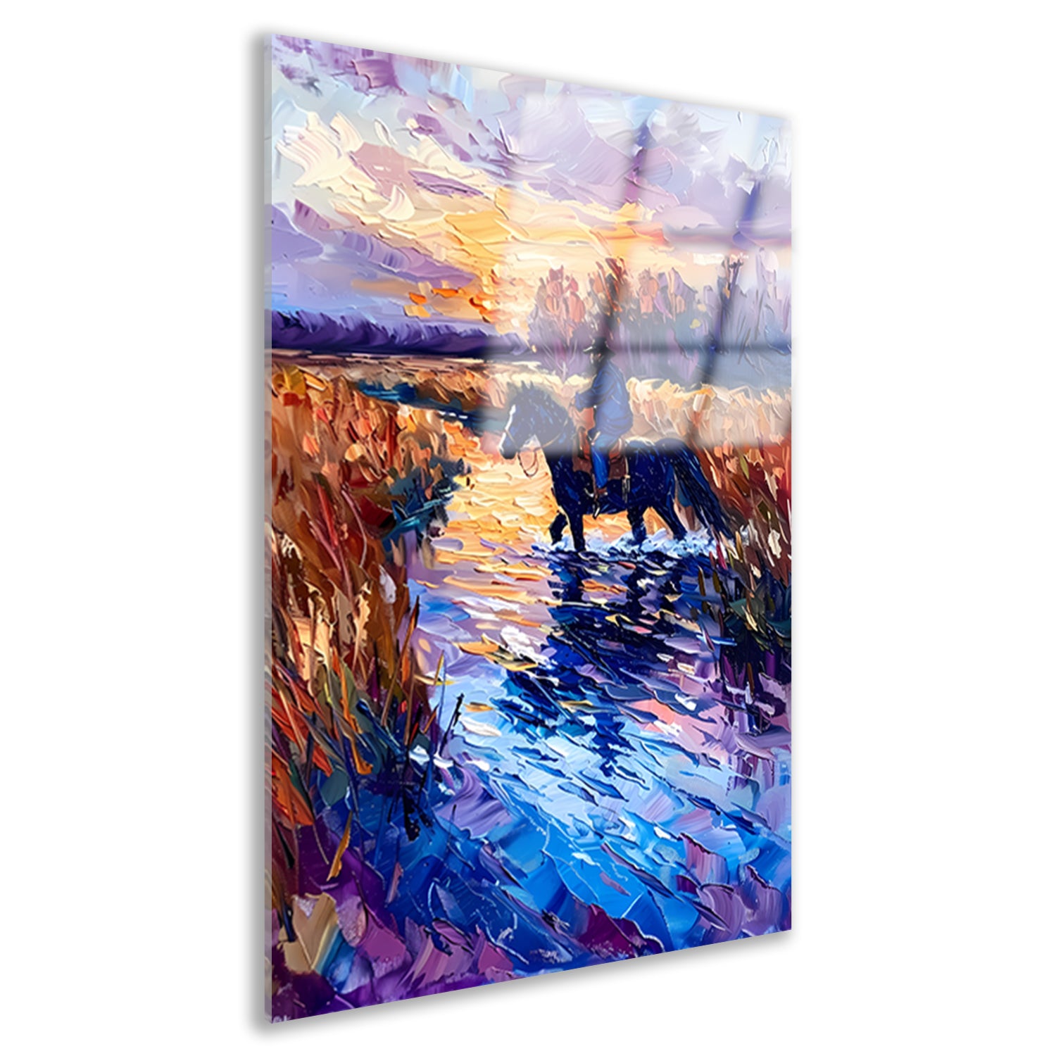 Ruiter op paard bij zonsondergang schilderij acrylglas