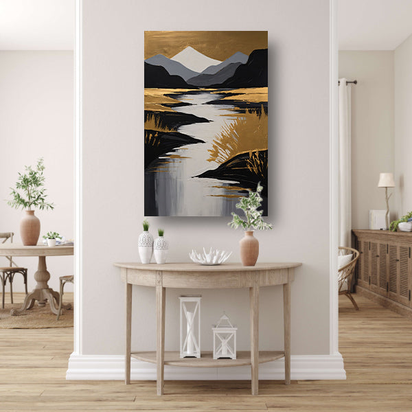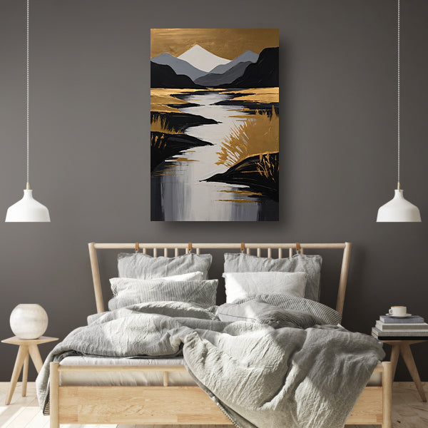 Rustic River Flowing Through Monochrome Mountains canvas met baklijst
