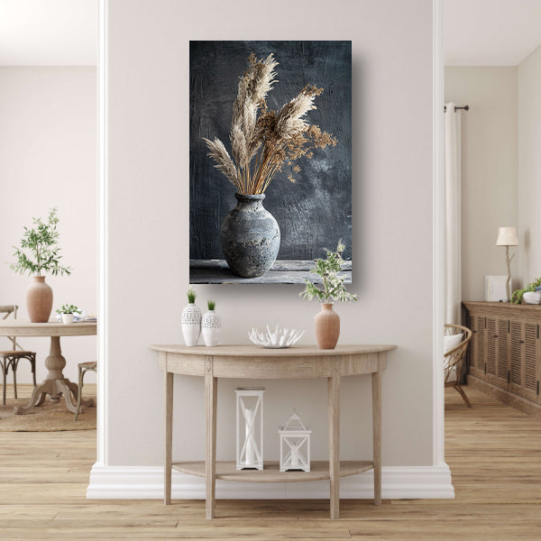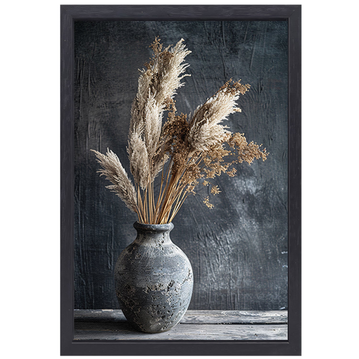 Rustieke blauwe vaas met droge planten op tafel canvas met baklijst