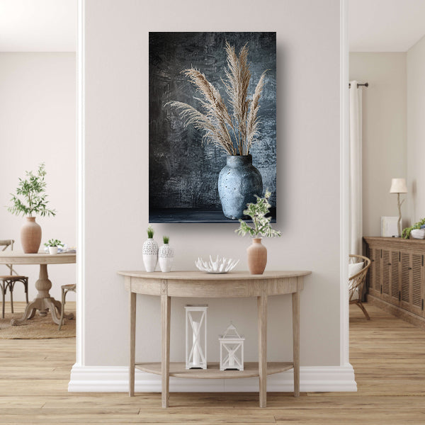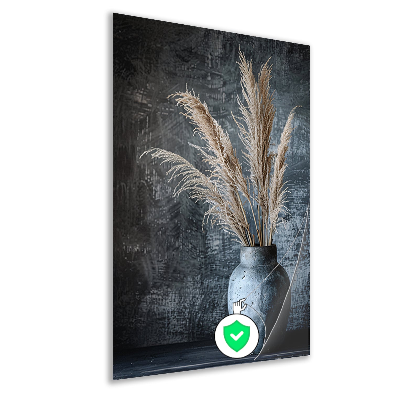 Rustieke blauwe vaas met graanstengels tegen donkere achtergrond poster