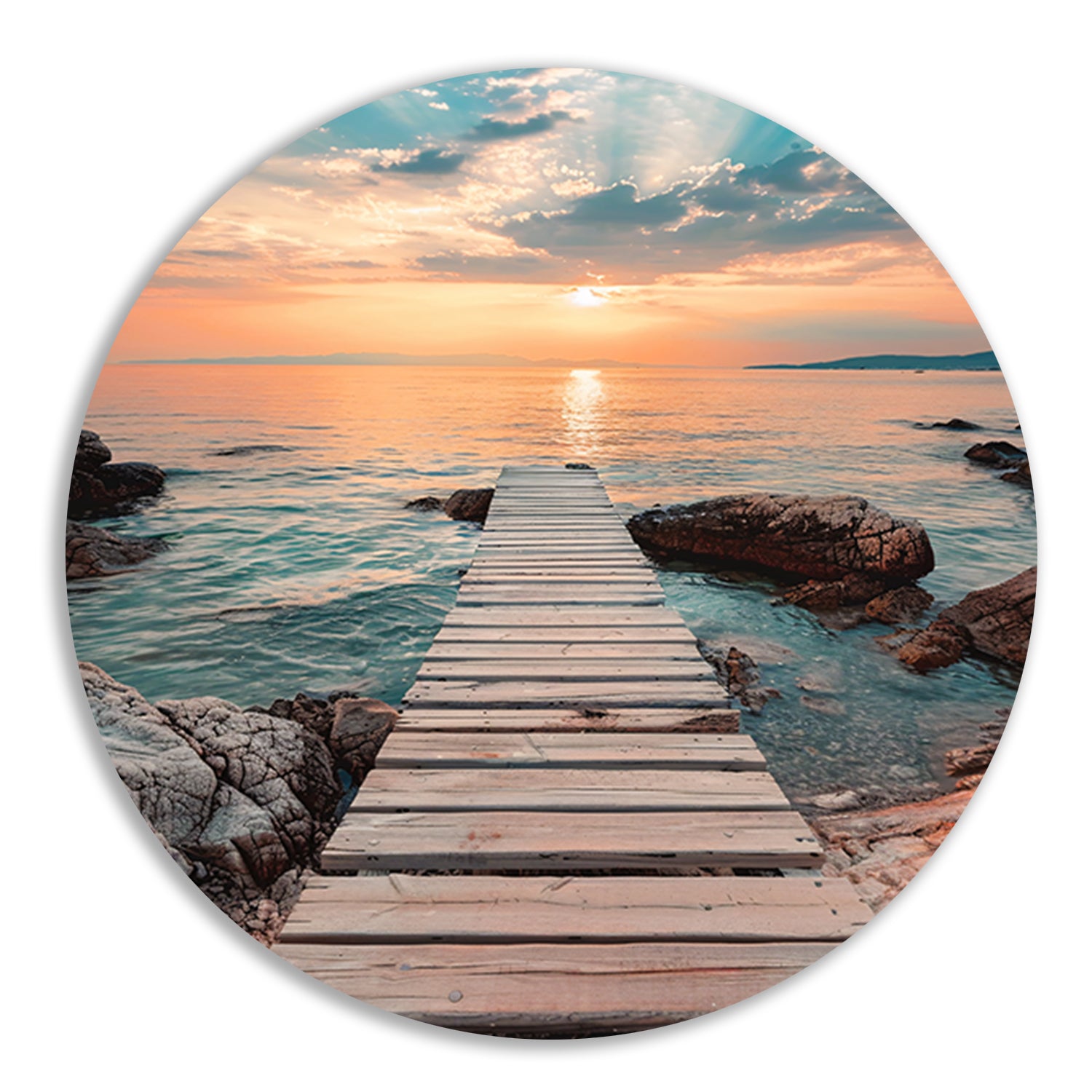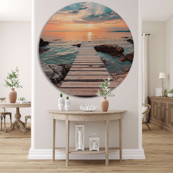 Rustieke houten steiger tijdens een kleurrijke zonsondergang aluminium muurcirkel