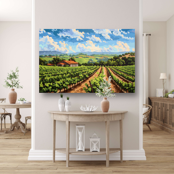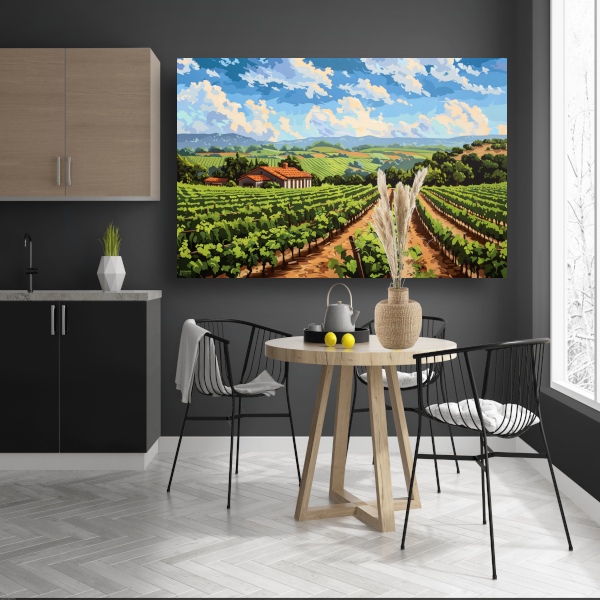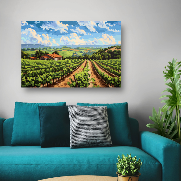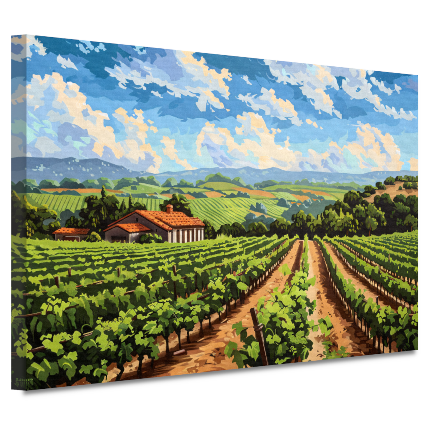 Rustige wijngaard met landhuis onder blauwe lucht canvas