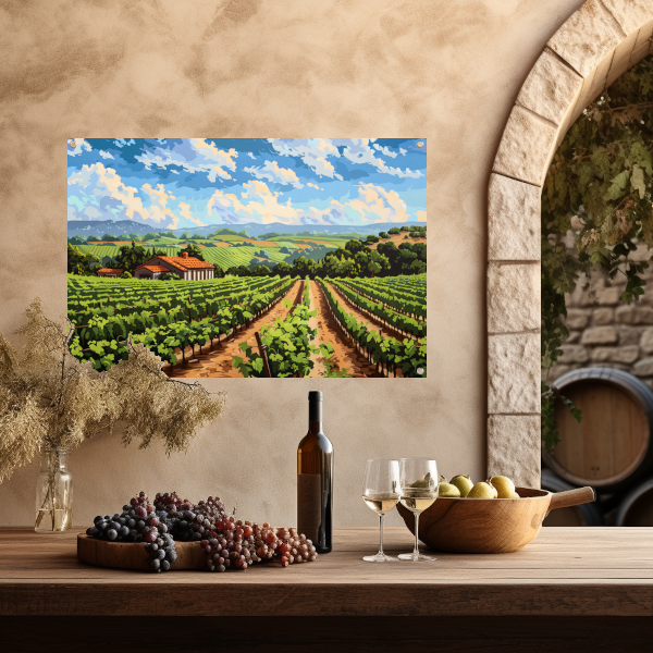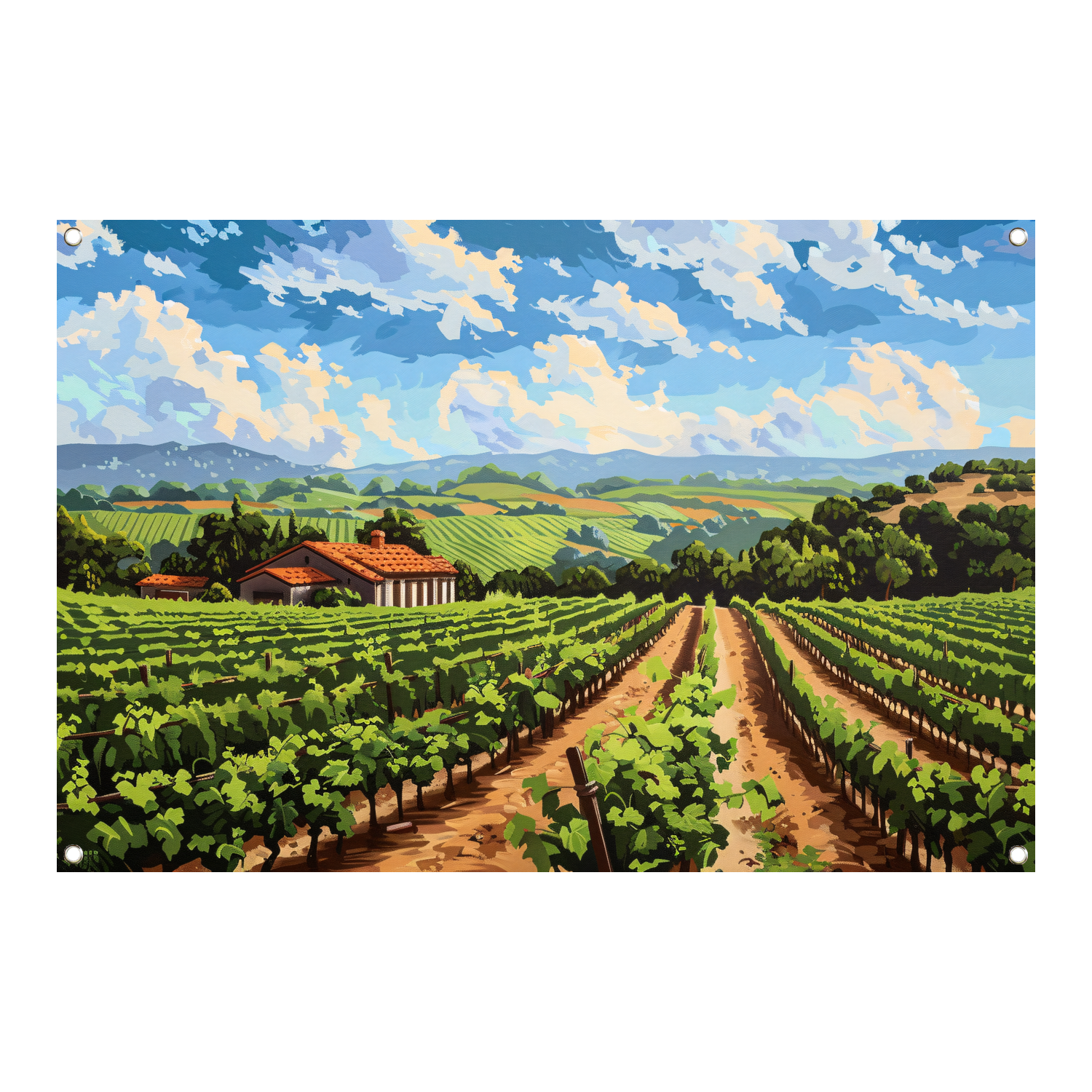 Rustige wijngaard met landhuis onder blauwe lucht tuinposter