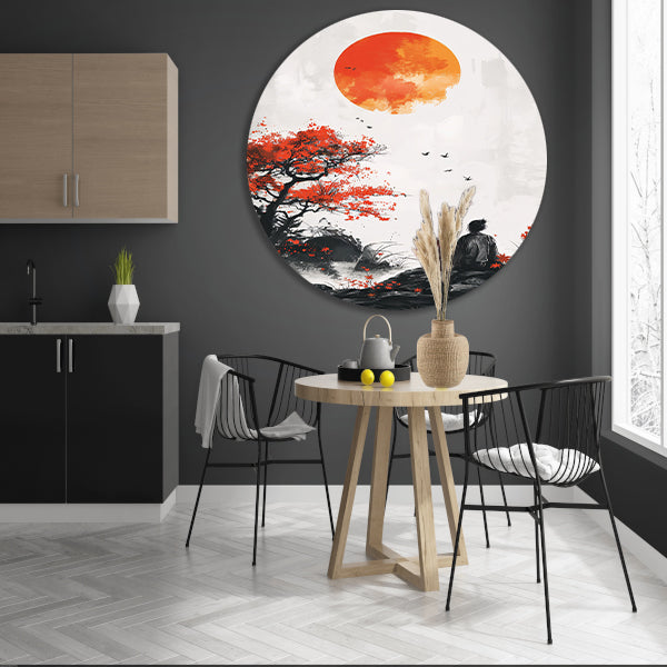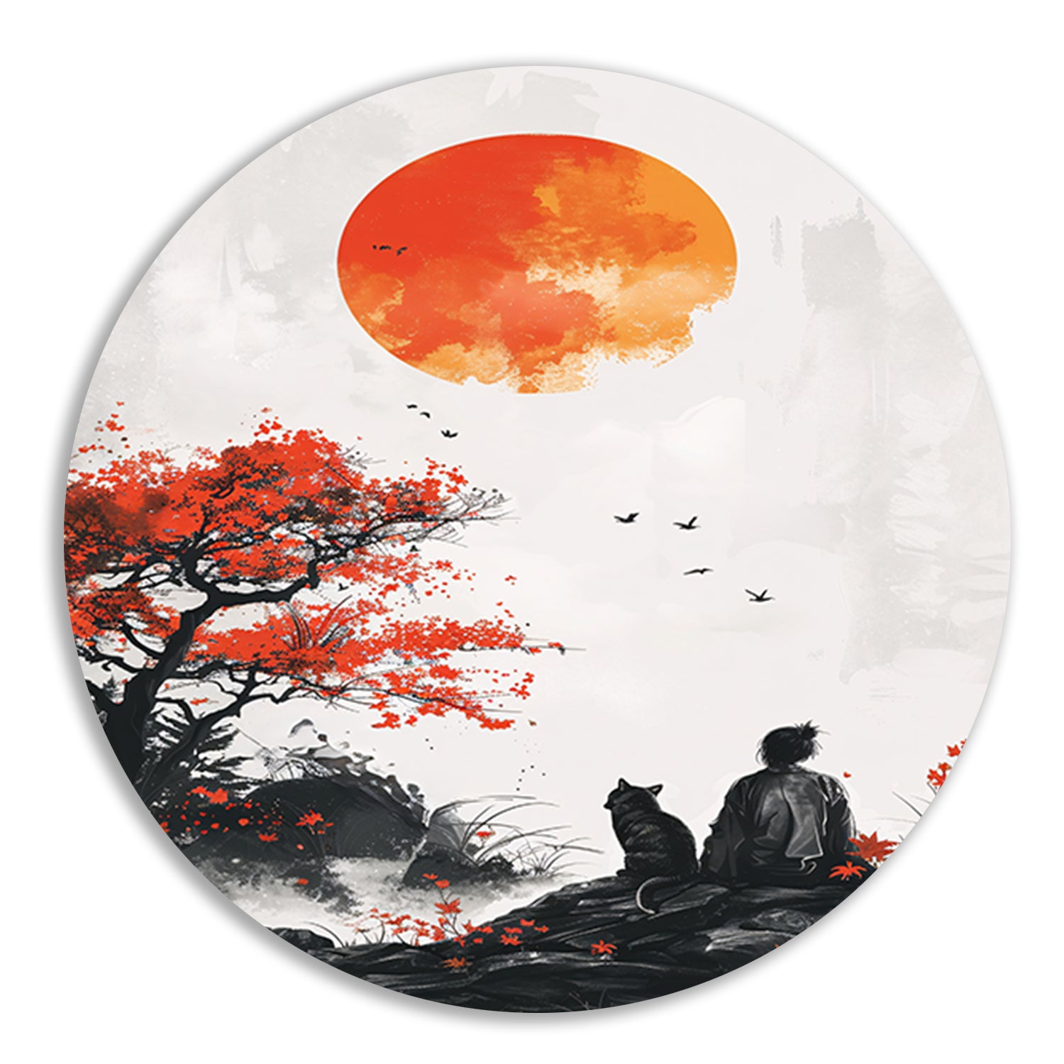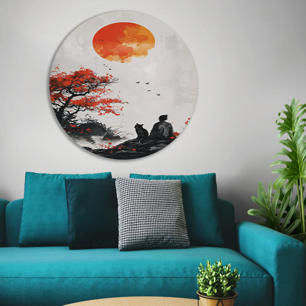 Samoerai en Kat in Herfstlandschap aluminium muurcirkel