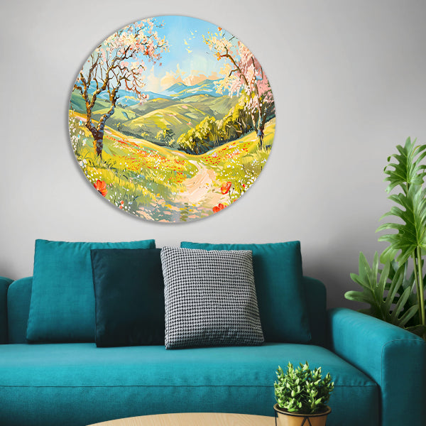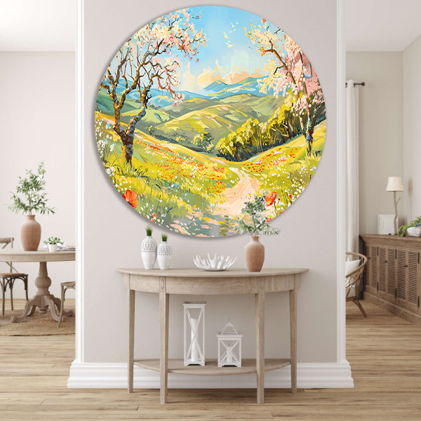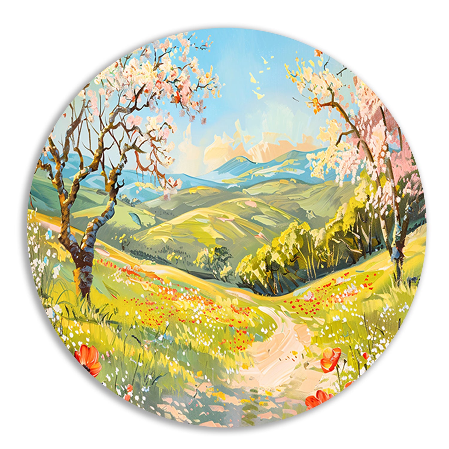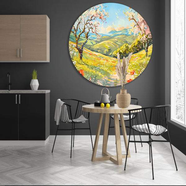 Schilderachtig lentelandschap met bloesembomen aluminium muurcirkel