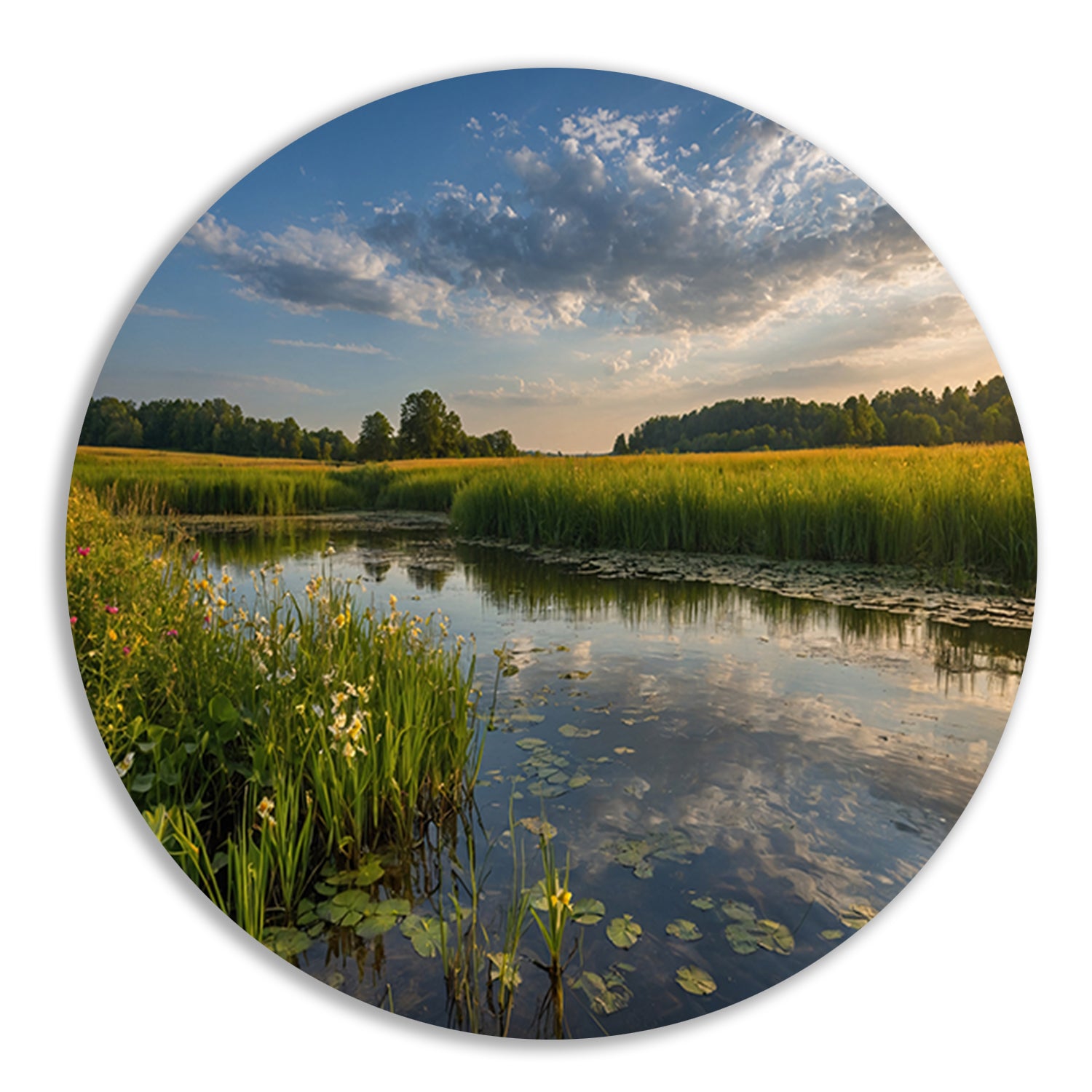 Schilderachtig zomerlandschap met bloemen en water aluminium muurcirkel
