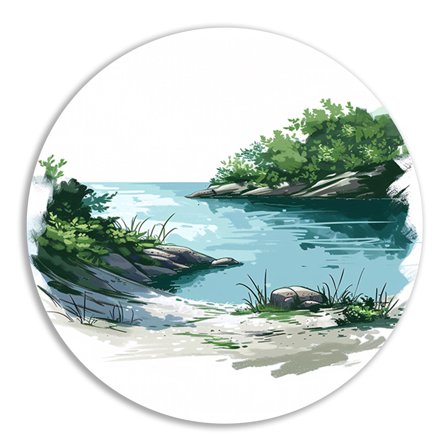Schilderij van een rustige oever met veel groen aluminium muurcirkel