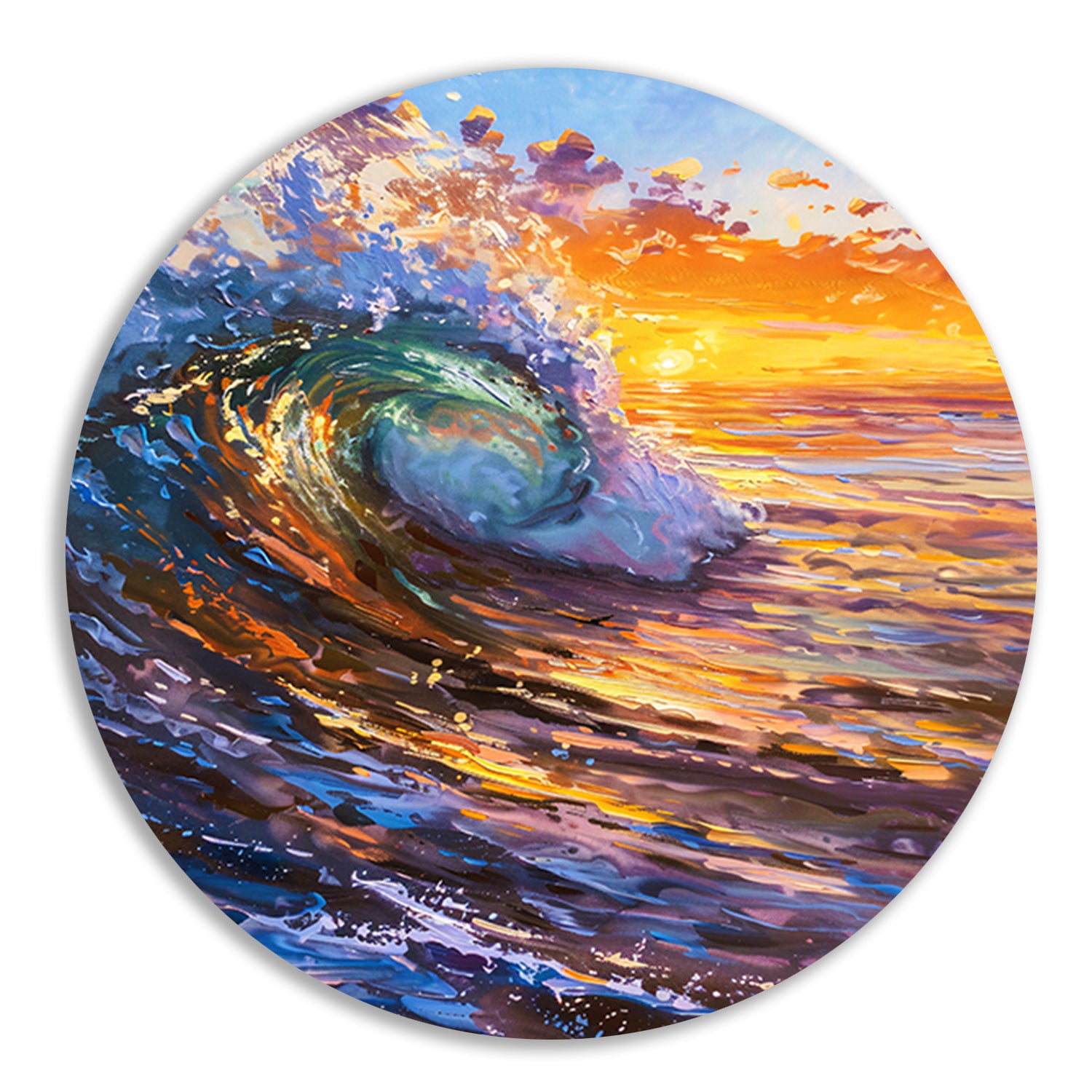 Schilderij van golf bij kleurrijke zonsondergang forex muurcirkel