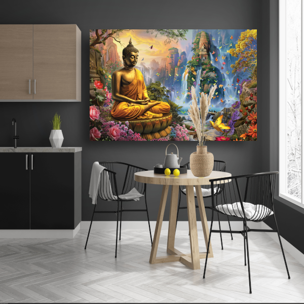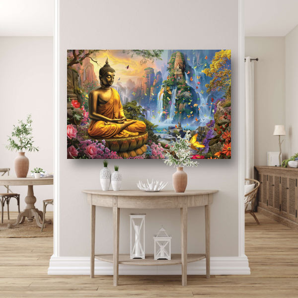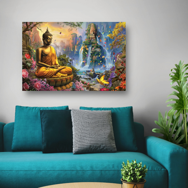 Serene Boeddha en Watervallen in Paradijselijke Natuur canvas met baklijst