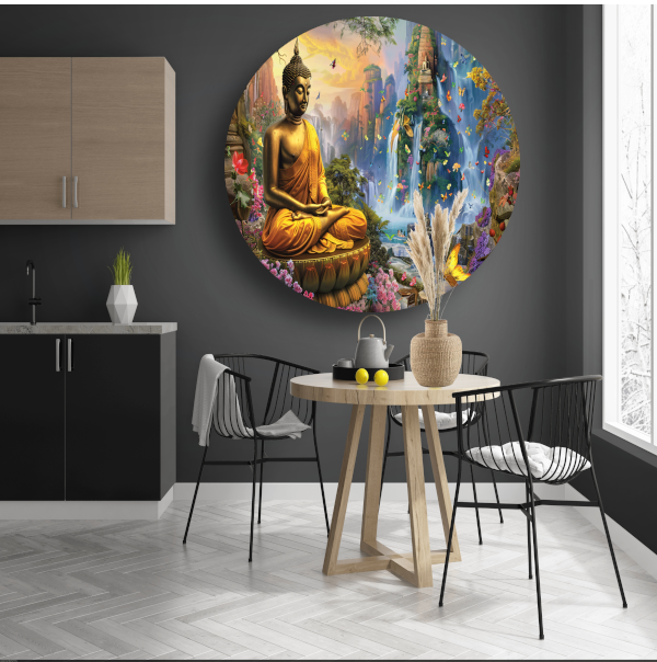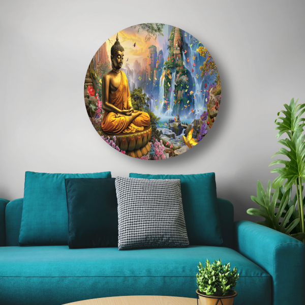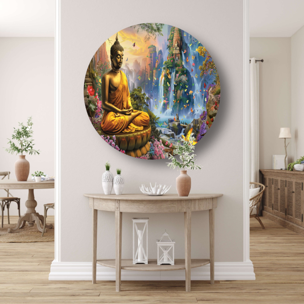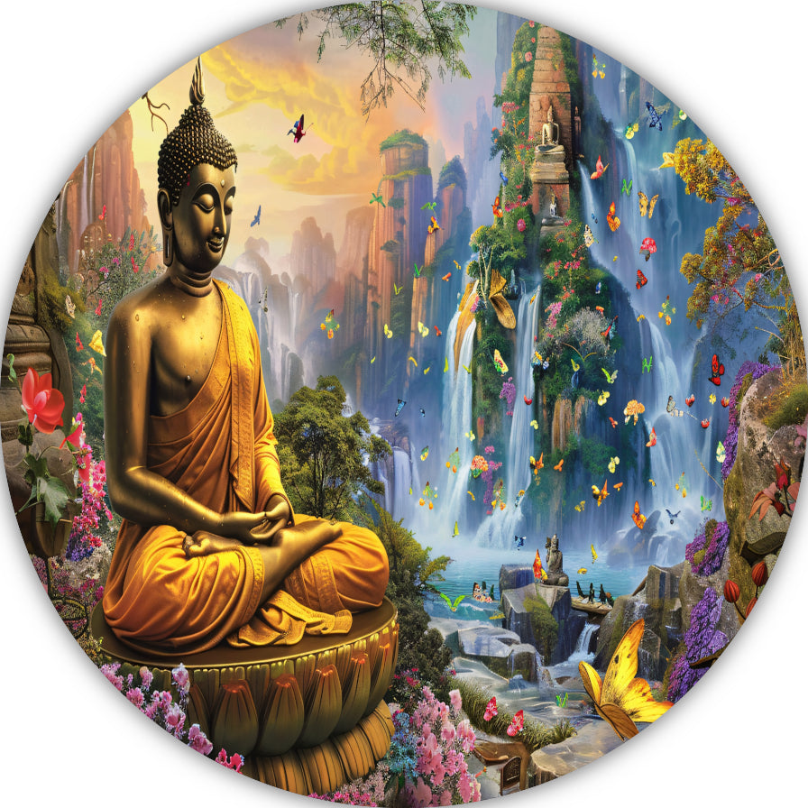 Serene Boeddha en Watervallen in Paradijselijke Natuur forex muurcirkel