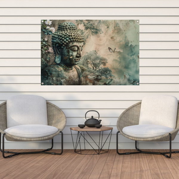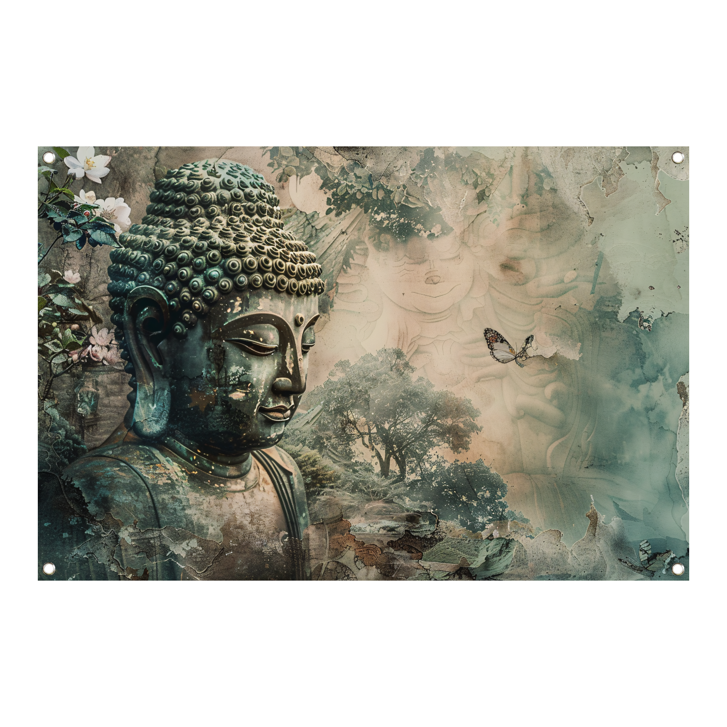 Serene Boeddha met bloesems in sepia tonen tuinposter
