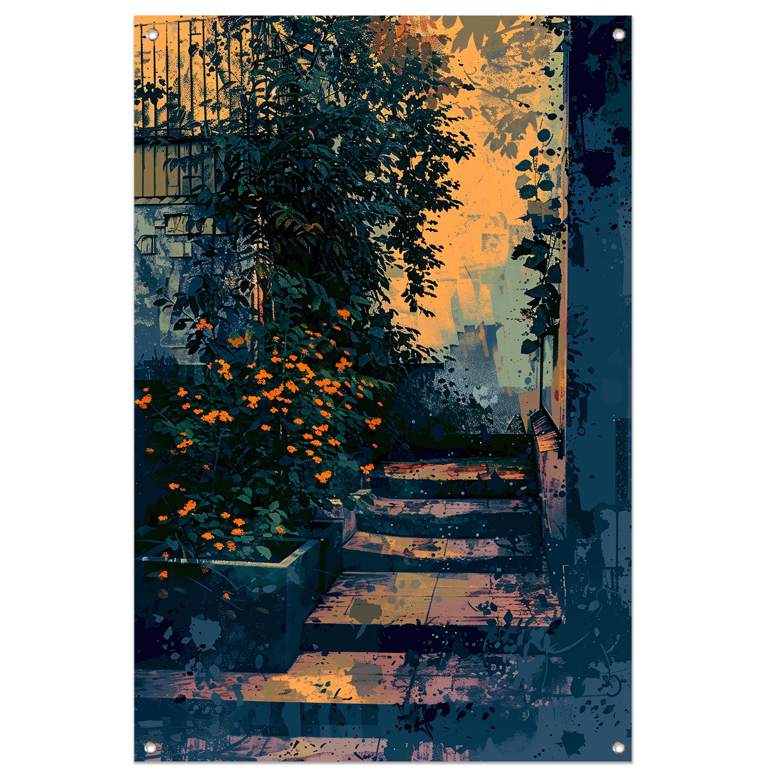 Serene tuin bij zonsondergang, digitale kunst tuinposter