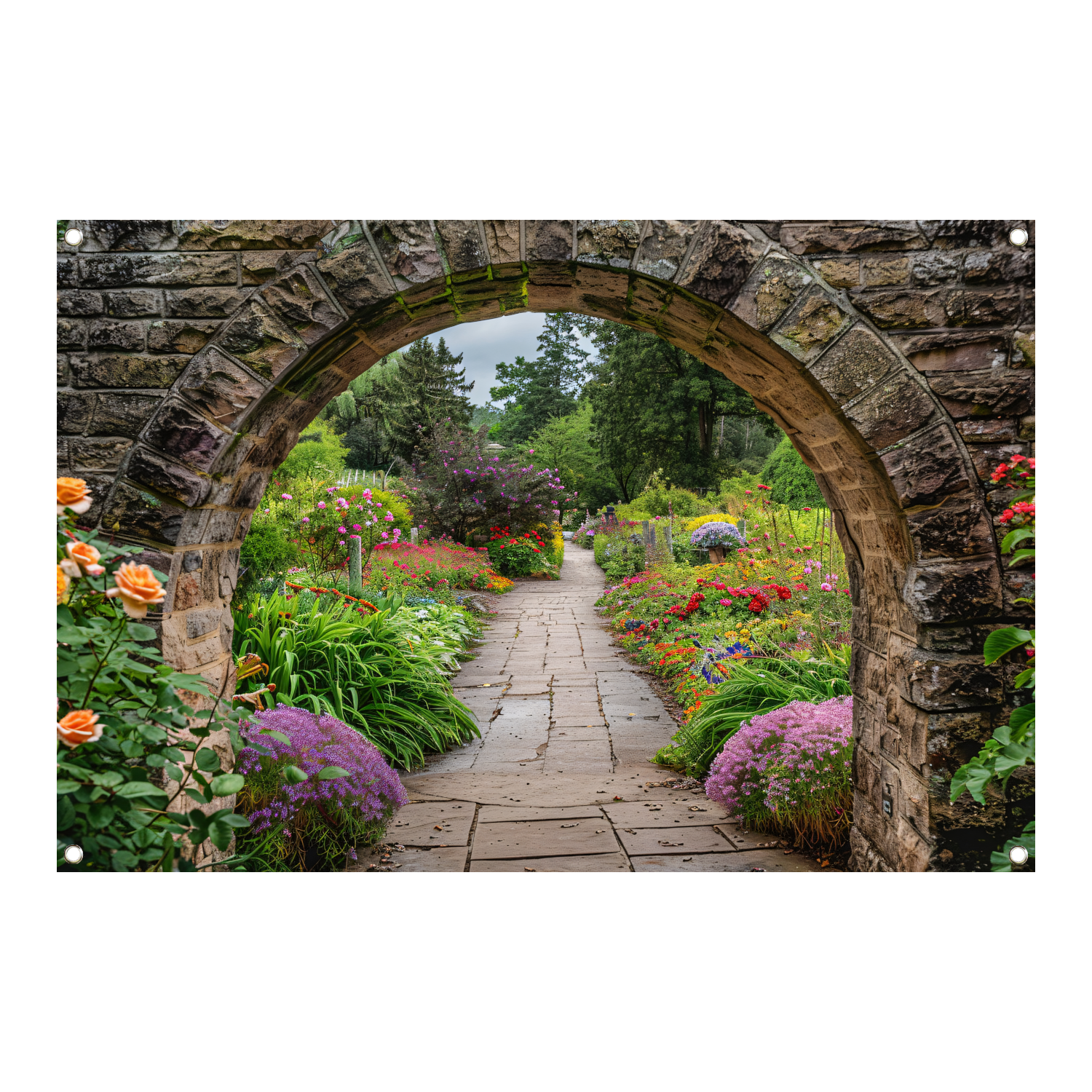 Serene Tuinpoort naar Weelderige Oase tuinposter