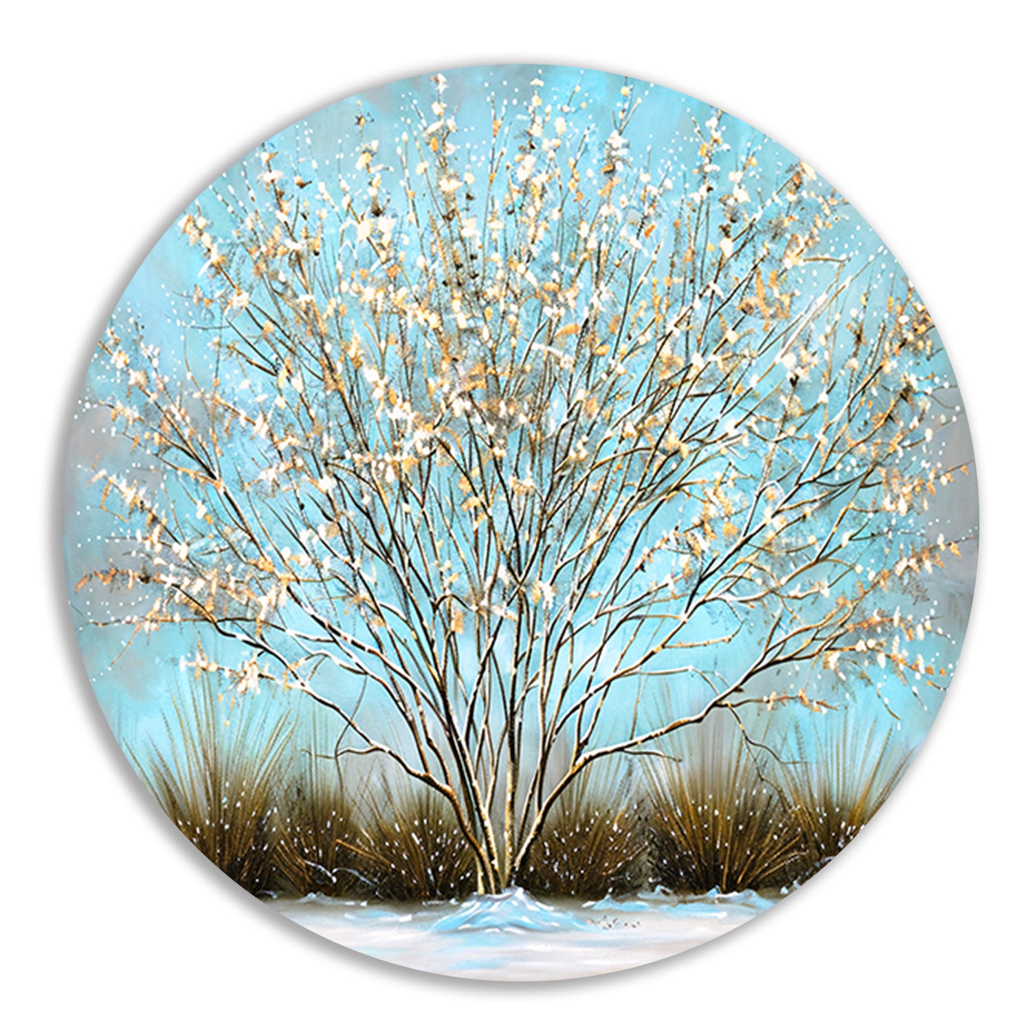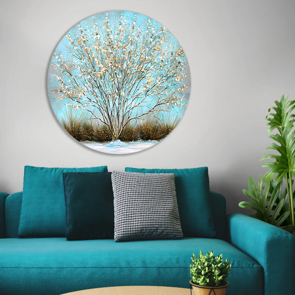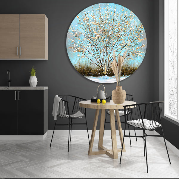 Sierlijke boom met sneeuw tegen blauwe lucht aluminium muurcirkel