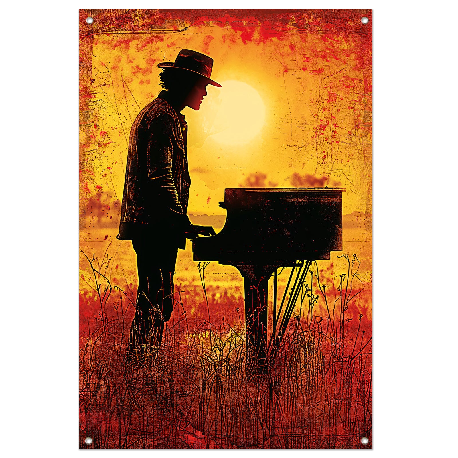Silhouet pianist bij zonsondergang kunstwerk tuinposter