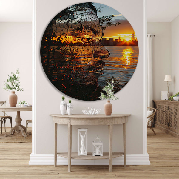 Silhouet tegen zonsondergang in gebroken glas aluminium muurcirkel