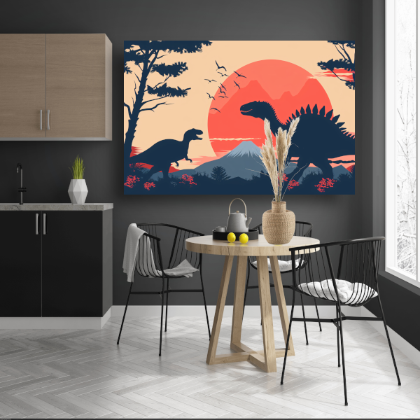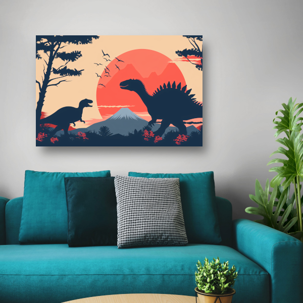 Silhouetten van dinos in prehistorisch landschap canvas met baklijst