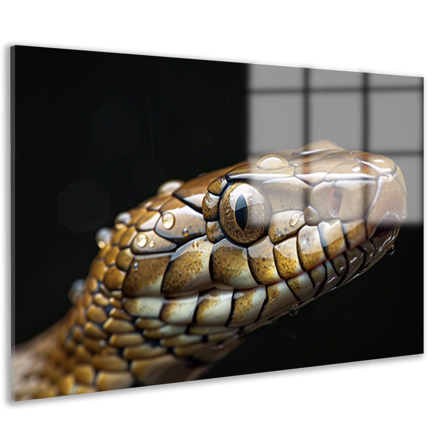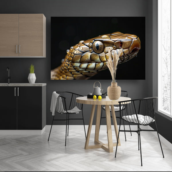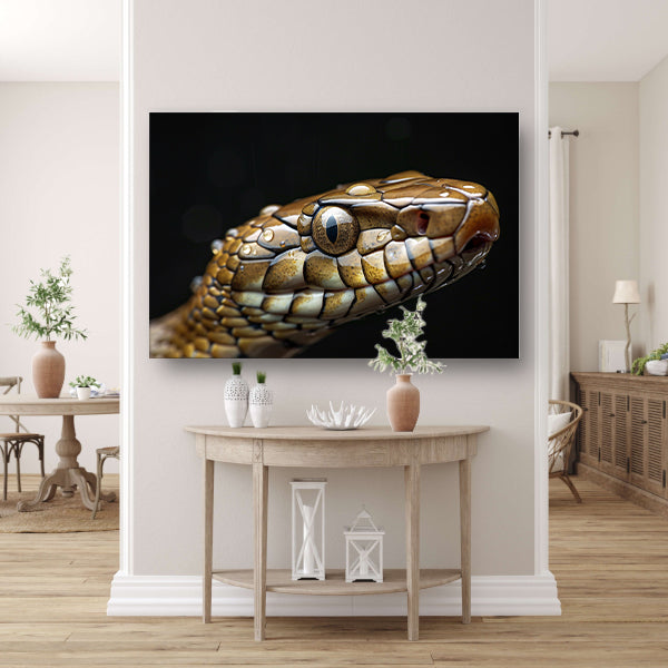 Met deze prachtige afbeelding van een slang met waterdruppels haalt u een uniek en stijlvol kunstwerk in huis dat zeker de aandacht zal trekken.
